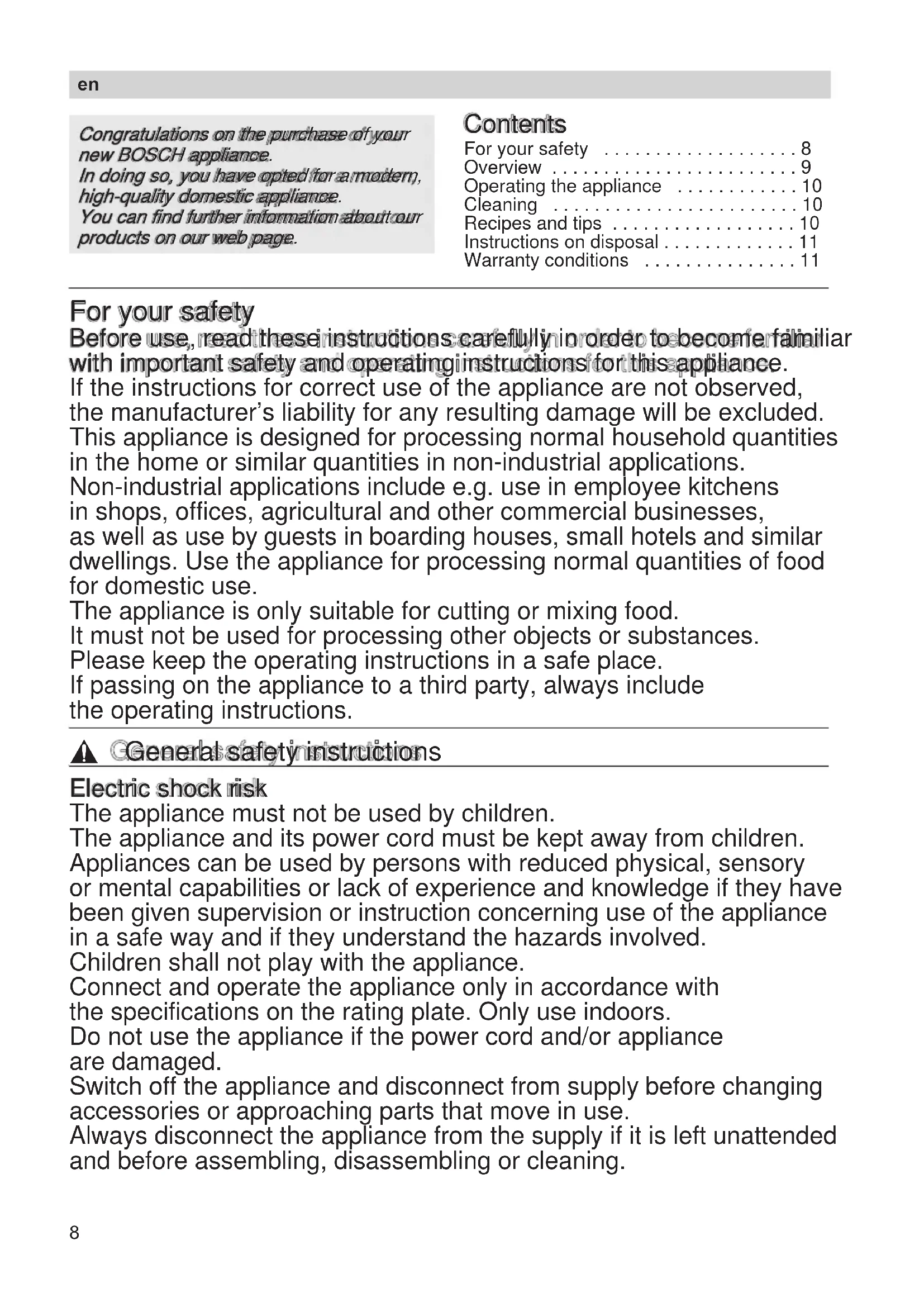 - Warranty conditions For your safety Before use, read these instructions carefully in order to become familiar with important safety and operating instructions for this appliance. If the instructions for correct use of the appliance are not observed, the manufacturer’s liability for any resulting damage will be excluded. This appliance is designed for processing normal household quantities in the home or similar quantities in non-industrial applications. Non-industrial applications include e.g. use in employee kitchens in shops, offices, agricultural and other commercial businesses, as well as use by guests in boarding houses, small hotels and similar dwellings. Use the appliance for processing normal quantities of food for domestic use. The appliance is only suitable for cutting or mixing food. It must not be used for processing other objects or substances. Please keep the operating instructions in a safe place. If passing on the appliance to a third party, always include the operating instructions. , General safety instructions Electric shock risk The appliance must not be used by children. The appliance and its power cord must be kept away from children. Appliances can be used by persons with reduced physical, sensory or mental capabilities or lack of experience and knowledge if they have been given supervision or instruction concerning use of the appliance in a safe way and if they understand the hazards involved. Children shall not play with the appliance. Connect and operate the appliance only in accordance with the specifications on the rating plate. Only use indoors. Do not use the appliance if the power cord and/or appliance are damaged. Switch off the appliance and disconnect from supply before changing accessories or approaching parts that move in use. Always disconnect the appliance from the supply if it is left unattended and before assembling, disassembling or cleaning. p. 11