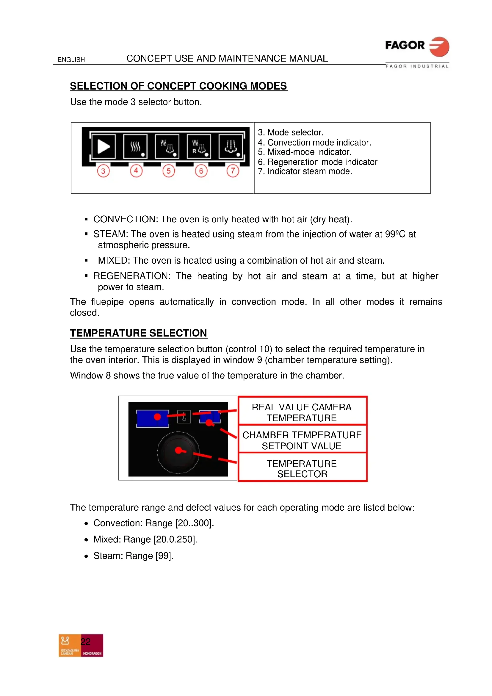 The temperature range and defect values for each operating mode are listed below: Convection: Range [20..300]. Mixed: Range [20.0.250]. Steam: Range [99].ENGLISH CONCEPT USE AND MAINTENANCE MANUAL