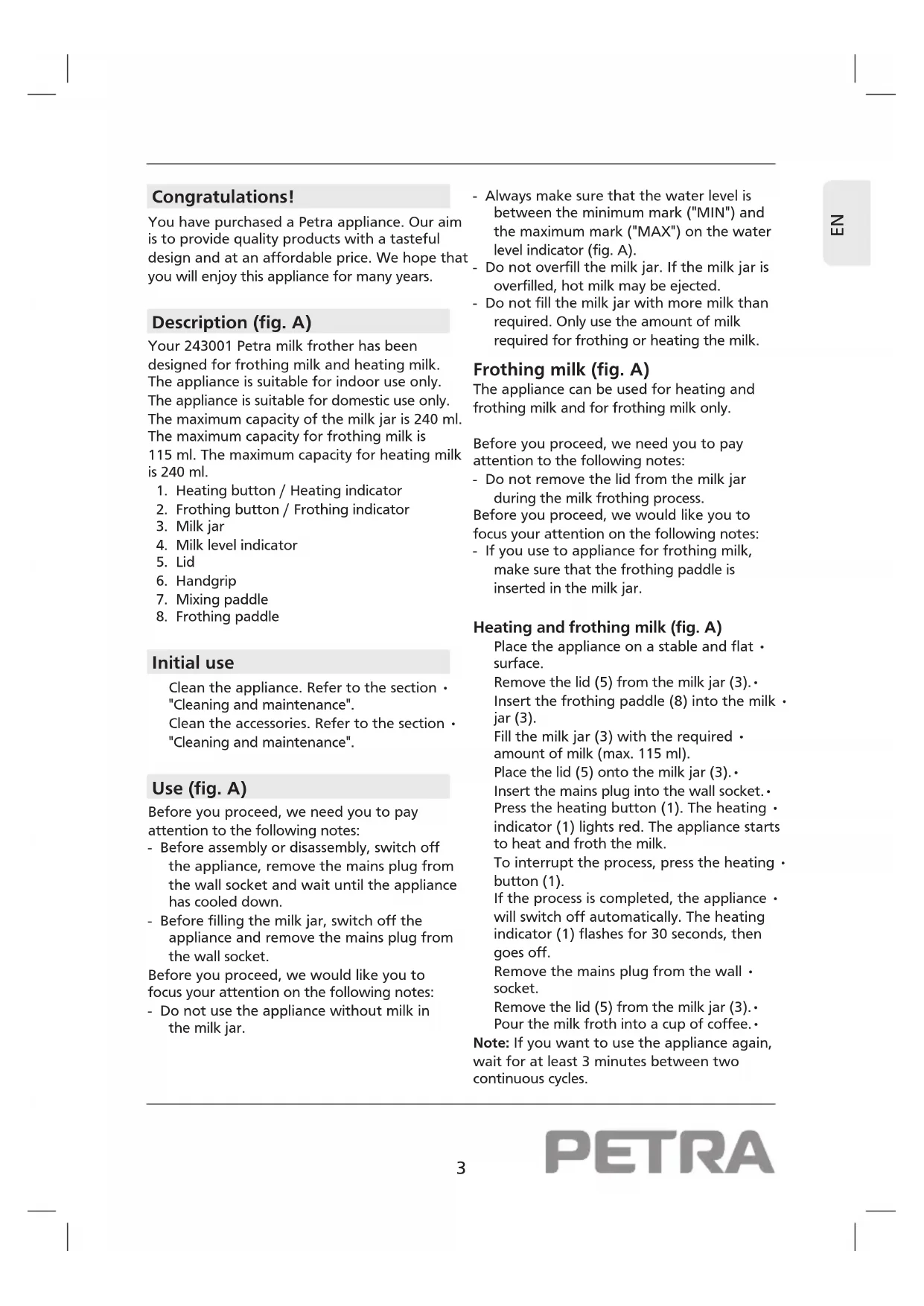 Congratulations! You have purchased a Petra appliance. Our aim is to provide quality products with a tasteful design and at an affordable price. We hope that you will enjoy this appliance for many years. Description (fig. A) Your 243001 Petra milk frother has been designed for frothing milk and heating milk. The appliance is suitable for indoor use only. The appliance is suitable for domestic use only. The maximum capacity of the milk jar is 240 ml. The maximum capacity for frothing milk is 115 ml. The maximum capacity for heating milk is 240 ml.