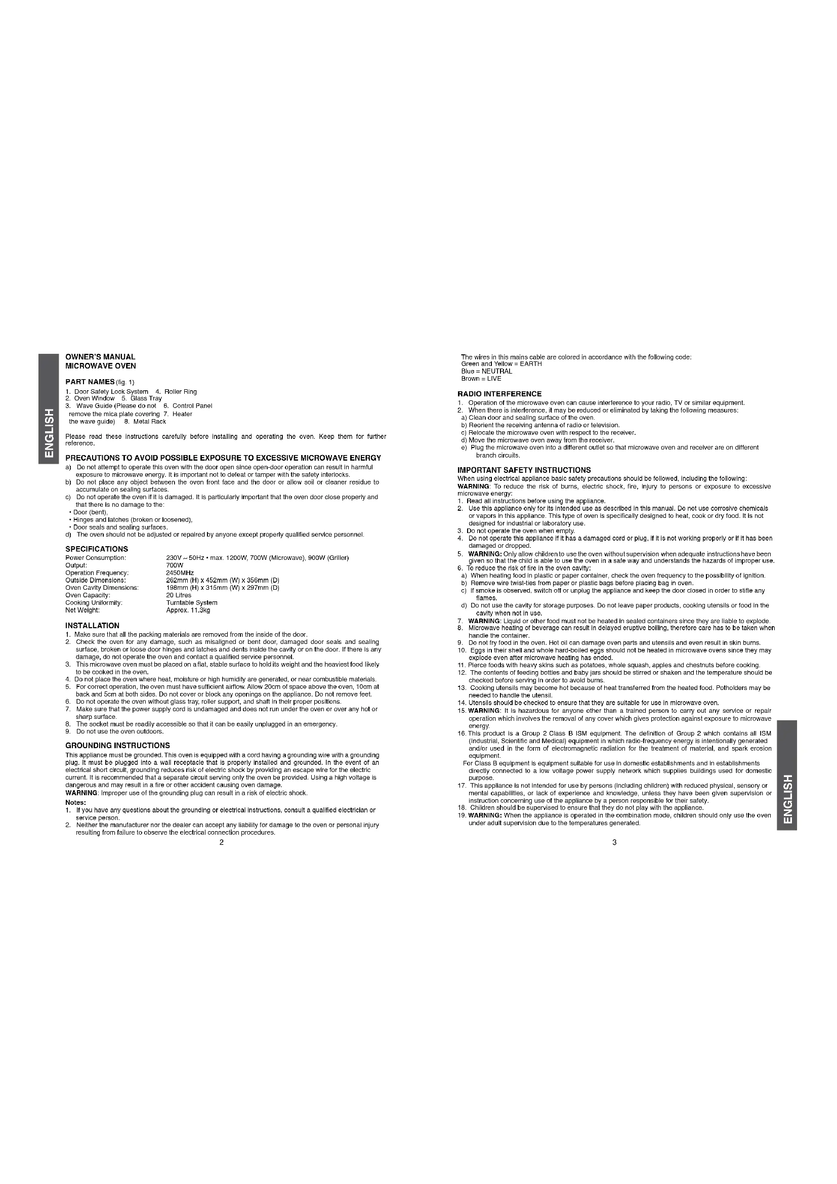 - Door seals and sealing surfaces. d) The oven should not be adjusted or repaired by anyone except properly qualied service personnel. SPECIFICATIONS Power Consumption: 230V ~ 50Hz • max. 1200W, 700W (Microwave), 900W (Griller) Output: 700W Operation Frequency: 2450MHz Outside Dimensions: 262mm (H) x 452mm (W) x 356mm (D) Oven Cavity Dimensions: 198mm (H) x 315mm (W) x 297mm (D) Oven Capacity: 20 Litres Cooking Uniformity: Turntable System Net Weight: Approx. 11.3kg INSTALLATION