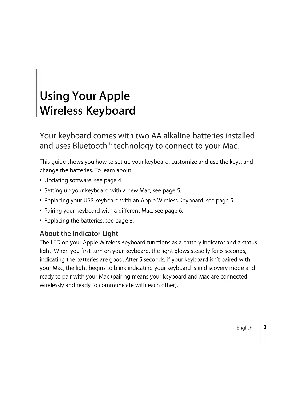 Replacing the batteries, see page 8. About the Indicator Light The LED on your Apple Wireless Keyboard functions as a battery indicator and a status light. When you first turn on your keyboard, the light glows steadily for 5 seconds, indicating the batteries are good. After 5 seconds, if your keyboard isn’t paired with your Mac, the light begins to blink indicating your keyboard is in discovery mode and ready to pair with your Mac (pairing means your keyboard and Mac are connected wirelessly and ready to communicate with each other).4 English If you don’t pair your keyboard with your Mac within 3 minutes, the indicator light and keyboard turn off to preserve battery life. Push and release the On/off (® ) switch to turn your keyboard on again, allowing you to pair it with your Mac (see page 5). Once you successfully pair your keyboard with your Mac, the indicator light glows steadily for 3 seconds, and then turns off. If you push the On/ off (® ) switch and the light doesn’t illuminate, you may need new or charged batteries. Updating Your Software To use your keyboard and its full range of features, update your Mac to Mac OS X v10.5.8 or later and install the latest keyboard software. To update to the latest version of Mac OS X, choose Apple ( ) > Software Update from the menu bar, and follow the onscreen instructions. When installation is complete and you’ve restarted your Mac, use Software Update again to make sure all of the available updates are installed. On/off switch Indicator lightEnglish