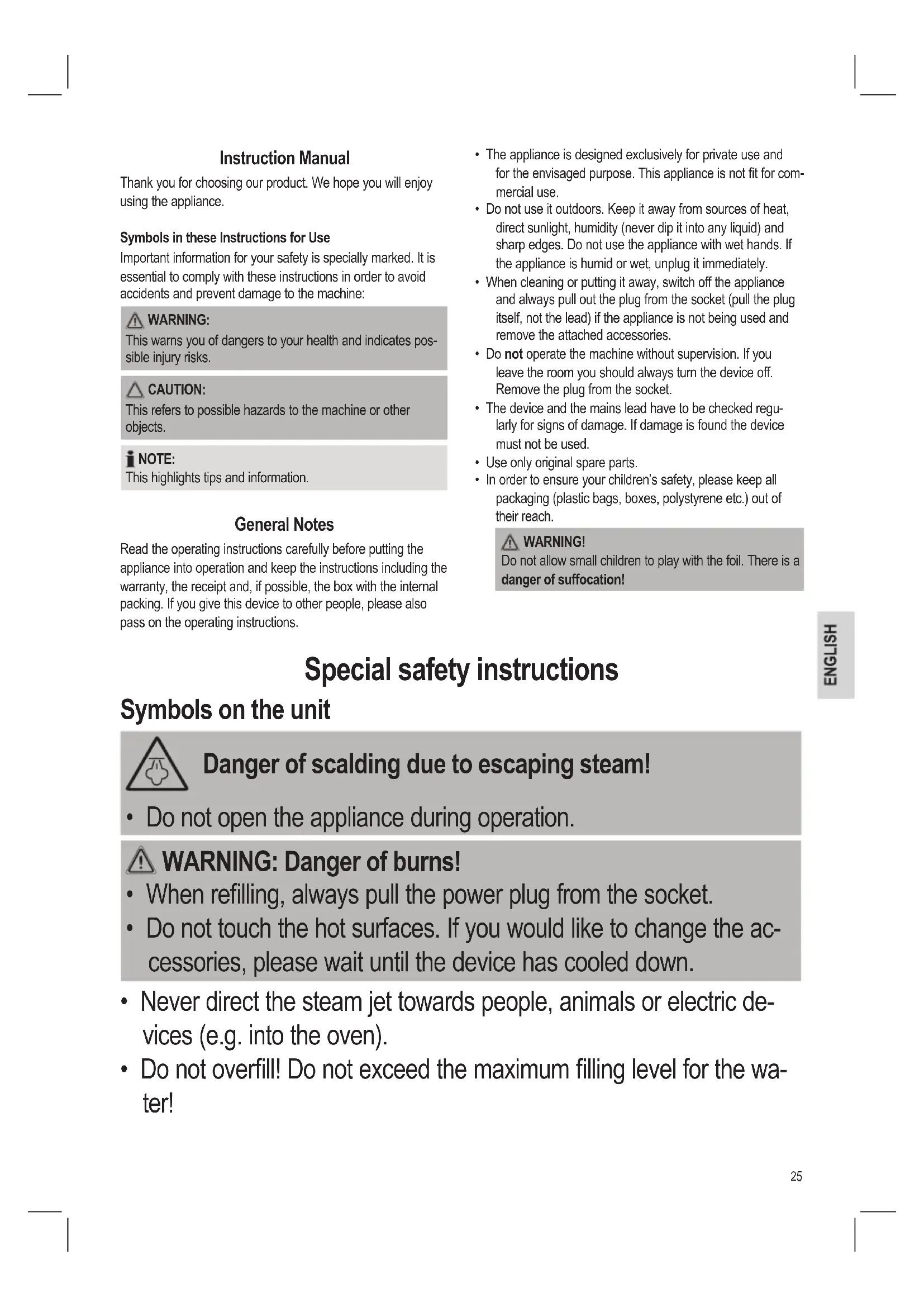 - In order to ensure your children’s safety, please keep all packaging (plastic bags, boxes, polystyrene etc.) out of their reach. WARNING! Do not allow small children to play with the foil. There is a danger of suffocation! Special safety instructions Symbols on the unit Danger of scalding due to escaping steam!