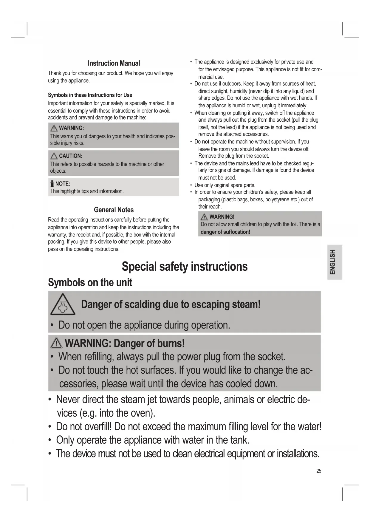 This warns you of dangers to your health and indicates pos- sible injury risks. CAUTION: This refers to possible hazards to the machine or other objects. NOTE: This highlights tips and information. General Notes Read the operating instructions carefully before putting the appliance into operation and keep the instructions including the warranty, the receipt and, if possible, the box with the internal packing. If you give this device to other people, please also pass on the operating instructions. Special safety instructions Symbols on the unit Danger of scalding due to escaping steam!
