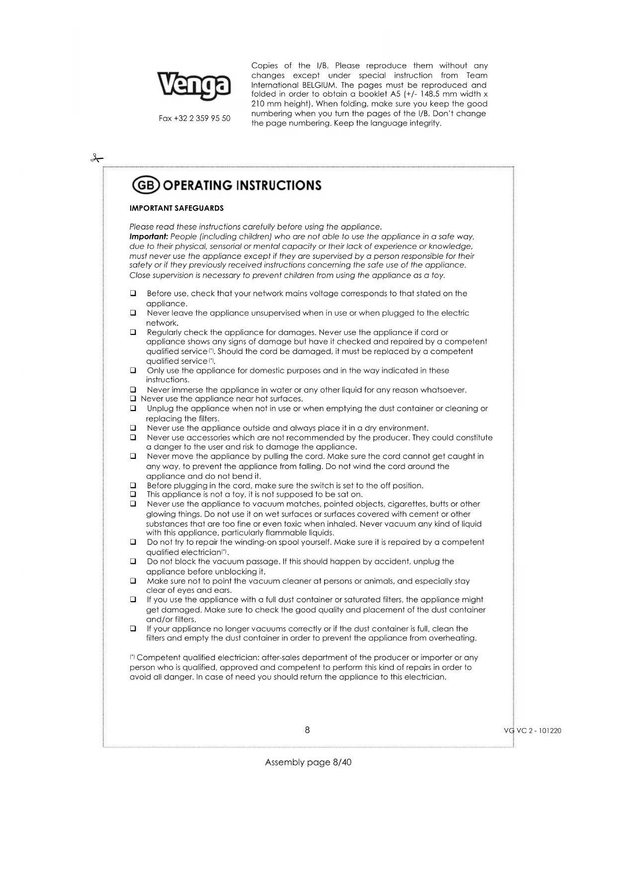 Regularly check the appliance for damages. Never use the appliance if cord or appliance shows any signs of damage but have it checked and repaired by a competent qualified service.[7]. Should the cord be damaged, it must be replaced by a competent qualified service.[8].