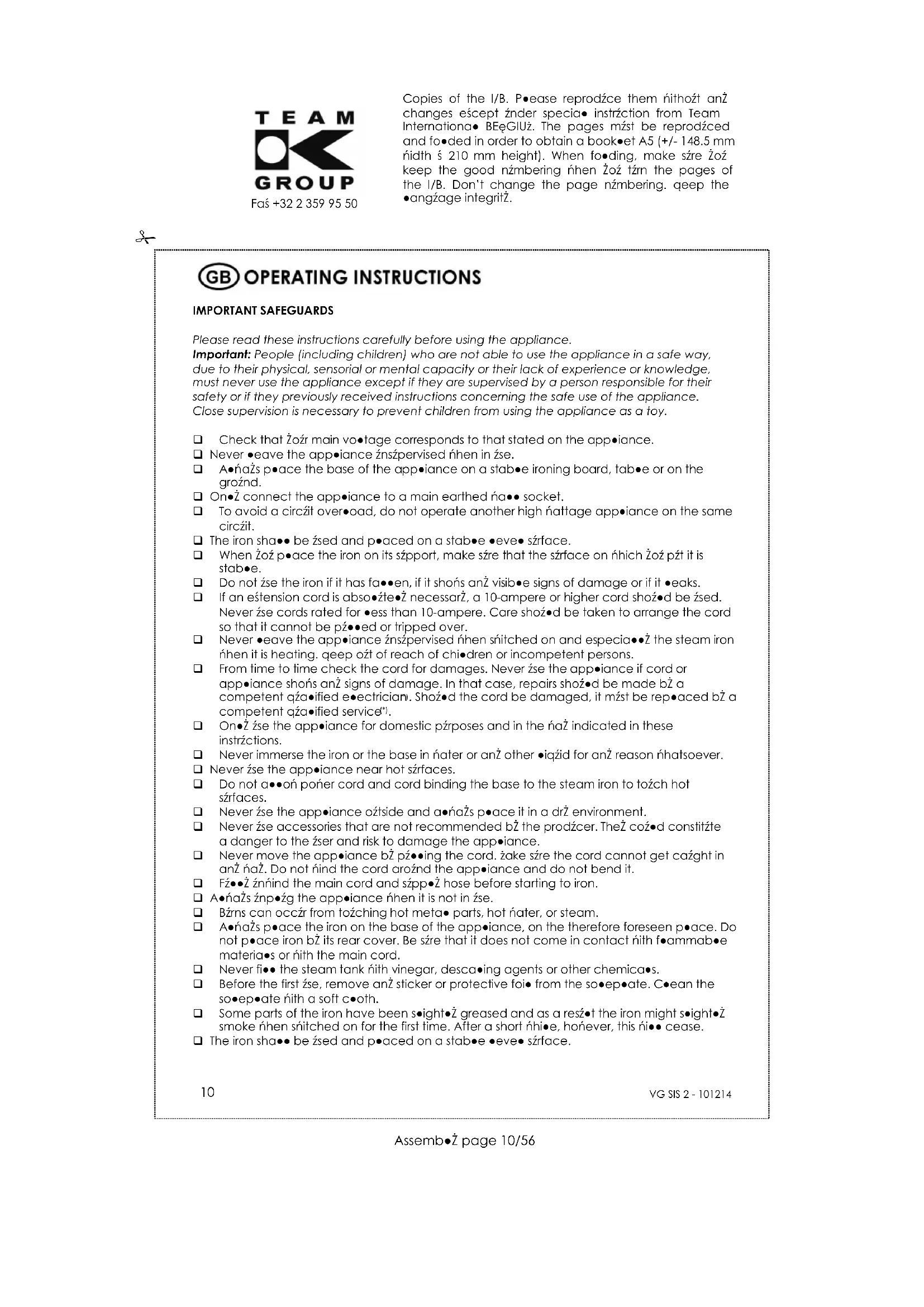 Copies of the I/B. Please reproduce them without any changes except under special instruction from Team International BELGIUM. The pages must be reproduced and folded in order to obtain a booklet A5 (+/- 148.5 mm width x 210 mm height). When folding, make sure you keep the good numbering when you turn the pages of the I/B. Don’t change the page numbering. Keep the language integrity.