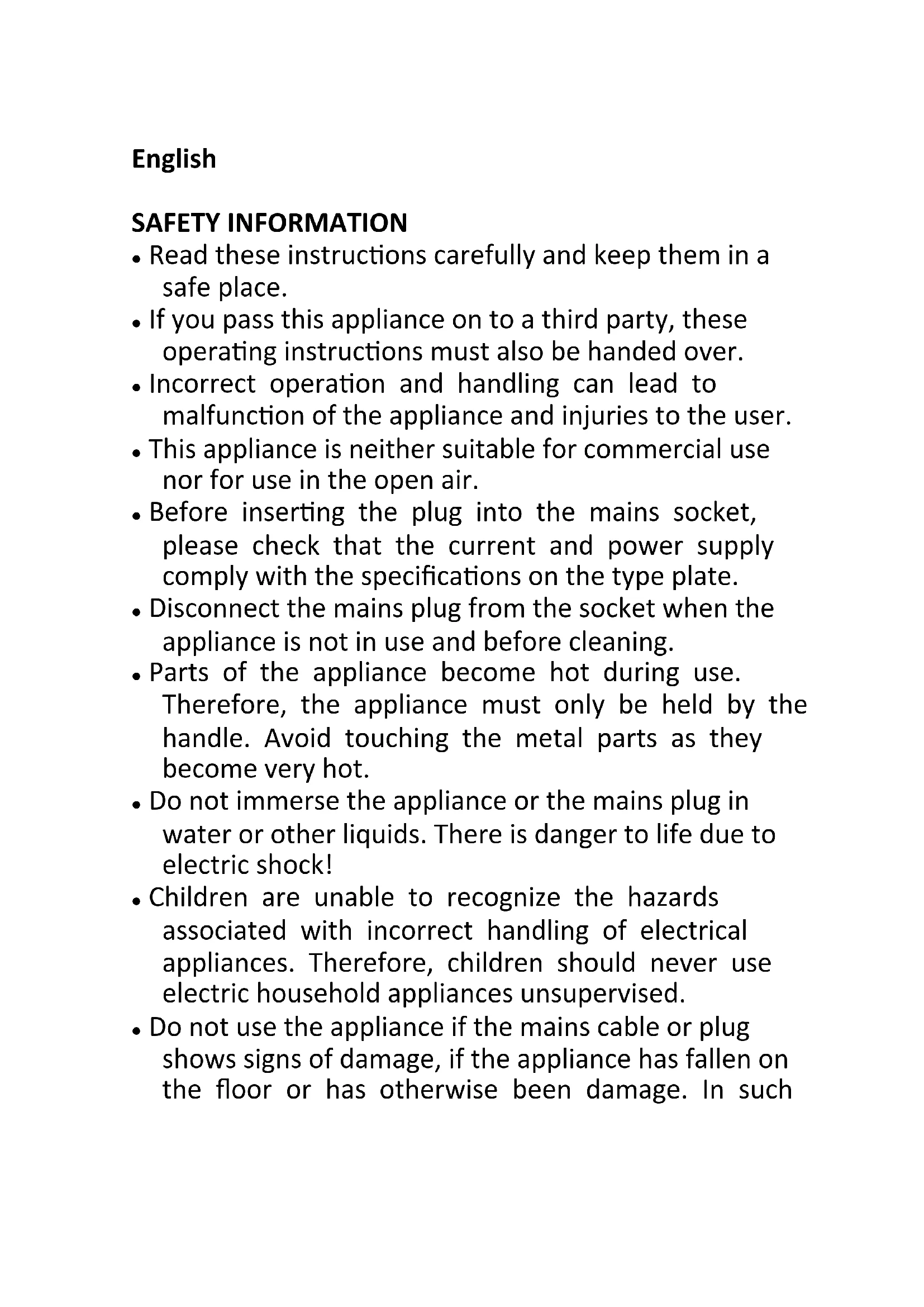 - Do not use the appliance if the mains cable or plug shows signs of damage, if the appliance has fallen on the floor or has otherwise been damaged. In such