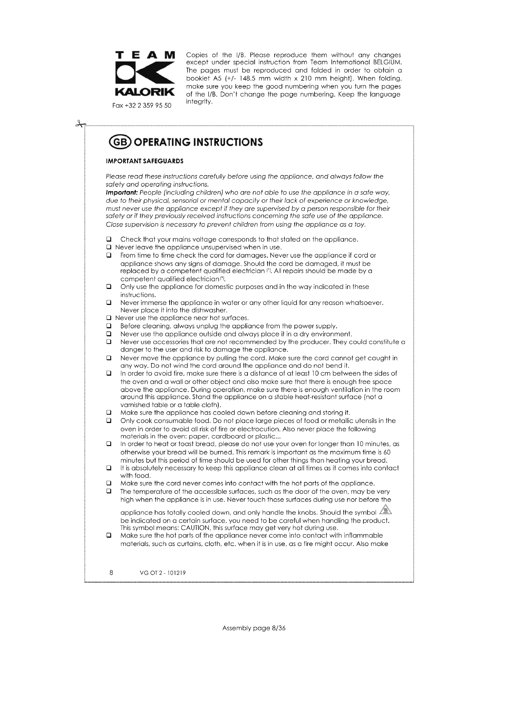 Assembly page 8/36Copies of the I/B. Please reproduce them without any changes except under special instruction from Team International BELGIUM. The pages must be reproduced and folded in order to obtain a booklet A5 (+/- 148.5 mm width x 210 mm height). When folding, make sure you keep the good numbering when you turn the pages of the I/B. Don’t change the page numbering. Keep the language integrity.