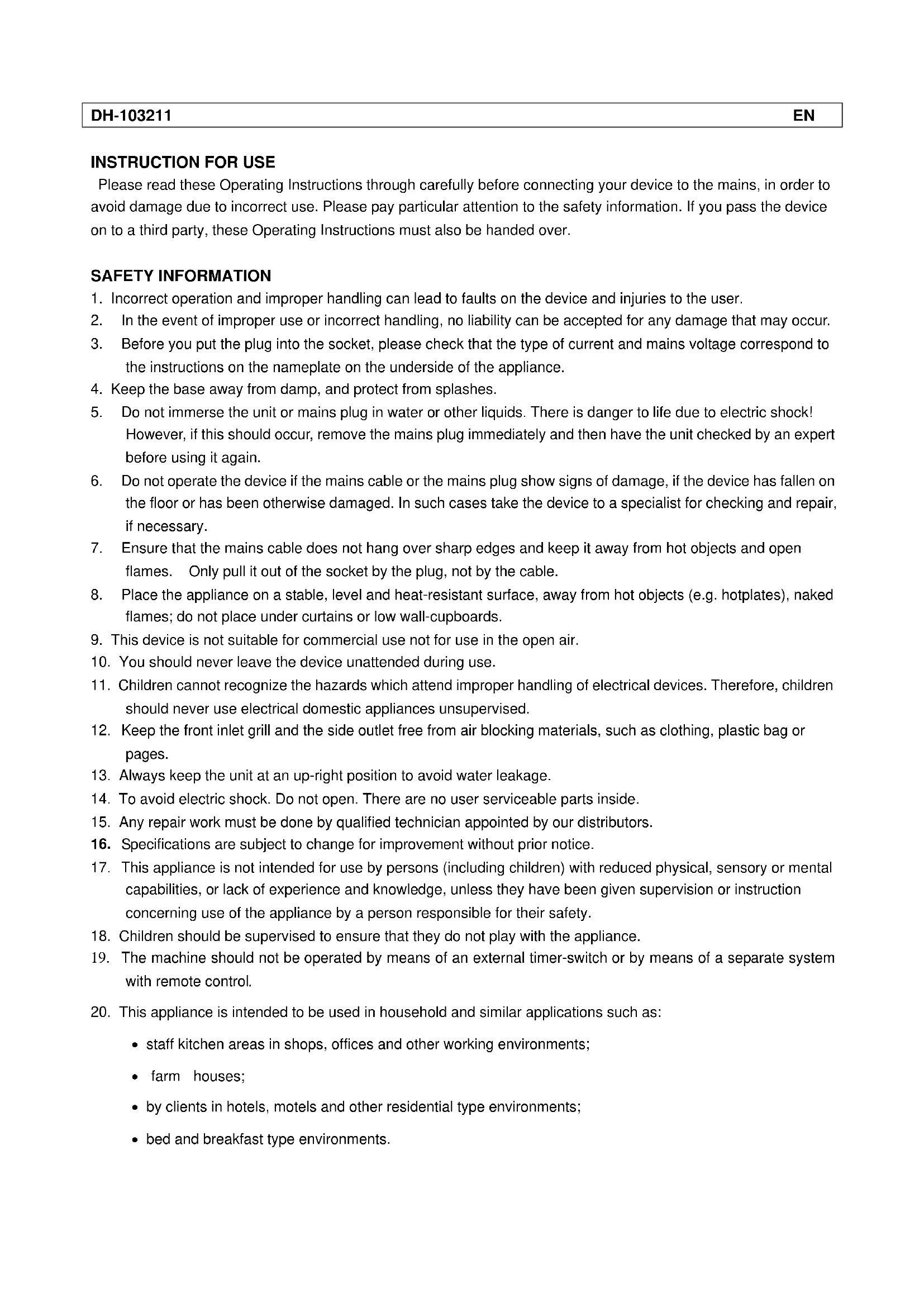 Download the instructions for your Humidifier in PDF format for free! Find your manual DH103211 - WAVES and take your electronic device back in hand. On this page are published all the documents necessary for the use of your device. DH103211 by WAVES.