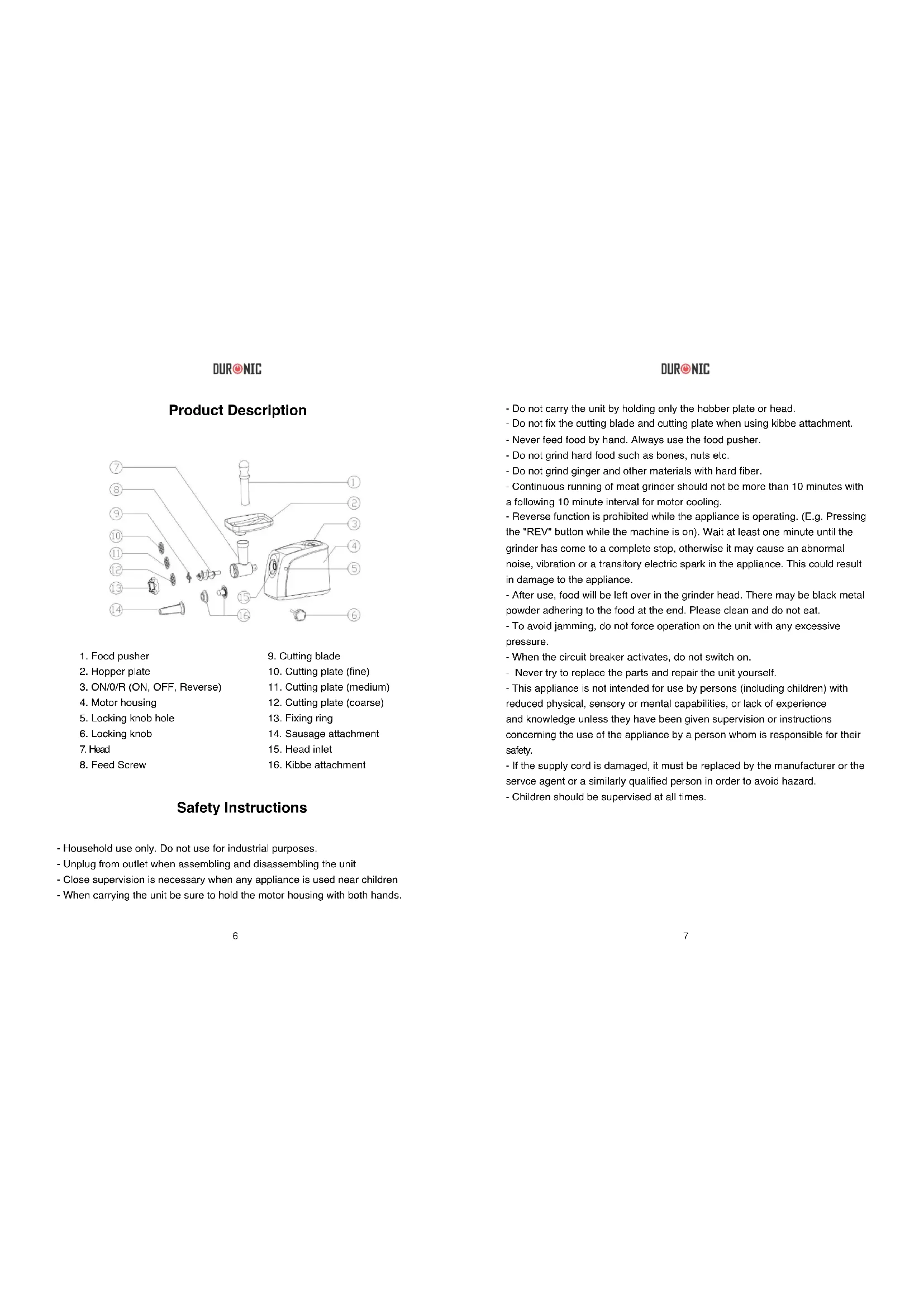 - Check that voltage indicated on the rating label corresponds to the mains voltage in your home. - Wash all parts (except body) with warm soapy water. Assembling - While holding the head, inset it into the inlet (g.1). Rotate the head in the same direction as g.2 until a click can be heard. Move the head slightly to ensure it is placed in securely. - Place the feed screw into the head (long end rst) by turning the feed screw until it is set into the motor housing (g.3). - Place the cutting blade onto the feed screw shaft with the blade facing the front as illustrated (g.4). If it is not tted properly, meat will not be ground. - Place the desired cutting plate next to the cutting blade, tting protrusions in the slots (g.5). - Support or press the centre of the cutting plate with one nger then screw the xing ring until tight with the other hand (g.6). Do not over tighten. - Place the hopper plate on the head and x into position. - Place the unit on a at, non slip surface. - The air passage at the bottom and the side of the motor housing should be kept free and not blocked. First Time Use Instructions for Use Cleaning and Maintenance Mincing Meat - Cut all food into pieces (boneless and fatless meat is recommended, approx 20mm x 20mm x 60mm) so that they fit easily into the hopper opening. - Plug in and press the ON/OFF button to turn on the machine. - Feed food into the hopper plate. Only use the food pusher (fig.7) - After use, switch the unit off and unplug it from the power supply. Reverse Function - In case of jamming, switch the appliance off by pressing the ‘ON/OFF’ button and press the "REV" button. - Feed screw will rotate in the opposite direction and the head will become empty. - If it doesn’t work, switch the unit off and clean it. Disassembling - Make sure that the motor has stopped completely. - Disconnect the plug from the power outlet. - Disassemble by reversing the steps from images 6-1. - If the xing ring is not easily removed by hand, please use tools in g 12. - To remove the cutting plate easily, place a screwdriver between the cutting plate and the head as illustrated and lift it up (g.13). - Press the unlock button before removing the head. Holding the head, rotate it in the same direction as g. 14. The head can then be removed easily.10 11 Cleaning - Never clean the unit in the dishwasher with a strong alkaline cleaner or a bleaching solution containing chlorine. This will discolour the surfaces. - Remove meat, etc. Wash each part seperately in warm soapy water. - Do not immerse the motor housing in water. Only wipe it with a damp cloth. - Thinners and petrol will crack or change the colour of the unit. - Wash all the metal parts in water below 50°C and dry. - Wipe all the cutting parts with oil and a wet cloth. - In case the unit is unused for a long time, wipe all metal parts before use. Making Kibbe Stufng Recipe Ingredients: Mutton 100g (mince once or twice) Olive oil 1 1/2 tablespoons Onion 1/2 cup Spices to your taste Salt to your taste Flour 1 1/12 tablespoons Case Ingredients: Lean meat 450g Flour 150-200g Spices to your taste 1 Grated nutmeg Pepper to your taste Making Sausage Before starting, please assemble sausage attachment as follows (g.11) - Fry onion in oil until brown and add minced mutton, spices, salt and our. - Mince meat 3 times and mix all ingredients together in a bowl. More meat and less our will create a better consistency and taste. - Grinde the mixture 3 times. - Disassemble by reversing the steps from 5-3 to remove the cutting plate and cutting blade. - Place kibbe attachments onto the feed screw shaft together, tting protrusions in the slots (g.8). - Screw xing ring into place until tight. Do not over tighten (g.9) - Make the cylindrical case (g.10). - Form kibbe as illustrated above and deep fry.12 13 Warranty 1 Year Guarantee from Shine-Mart Ltd, Trademark owners of Duronic Products. NOTE: THESE STATEMENTS DO NOT AFFECT YOUR STATUTORY RIGHTS AS A CONSUMER This product has been manufactured under the strictest or quality control procedures, and using the highest quality of materials, to ensure excellent performance and reliability. It will give very good and long lasting service, provided it is properly used and maintained. The product is guaranteed for 1 years from the date of original purchase. If any defect arises due to a faulty materials or poor workmanship, the faulty product must be returned to the original place of purchase. Refund or replacement is at the discretion of that company. Duronic Products are oered with a 1 year guarantee under the following conditions: