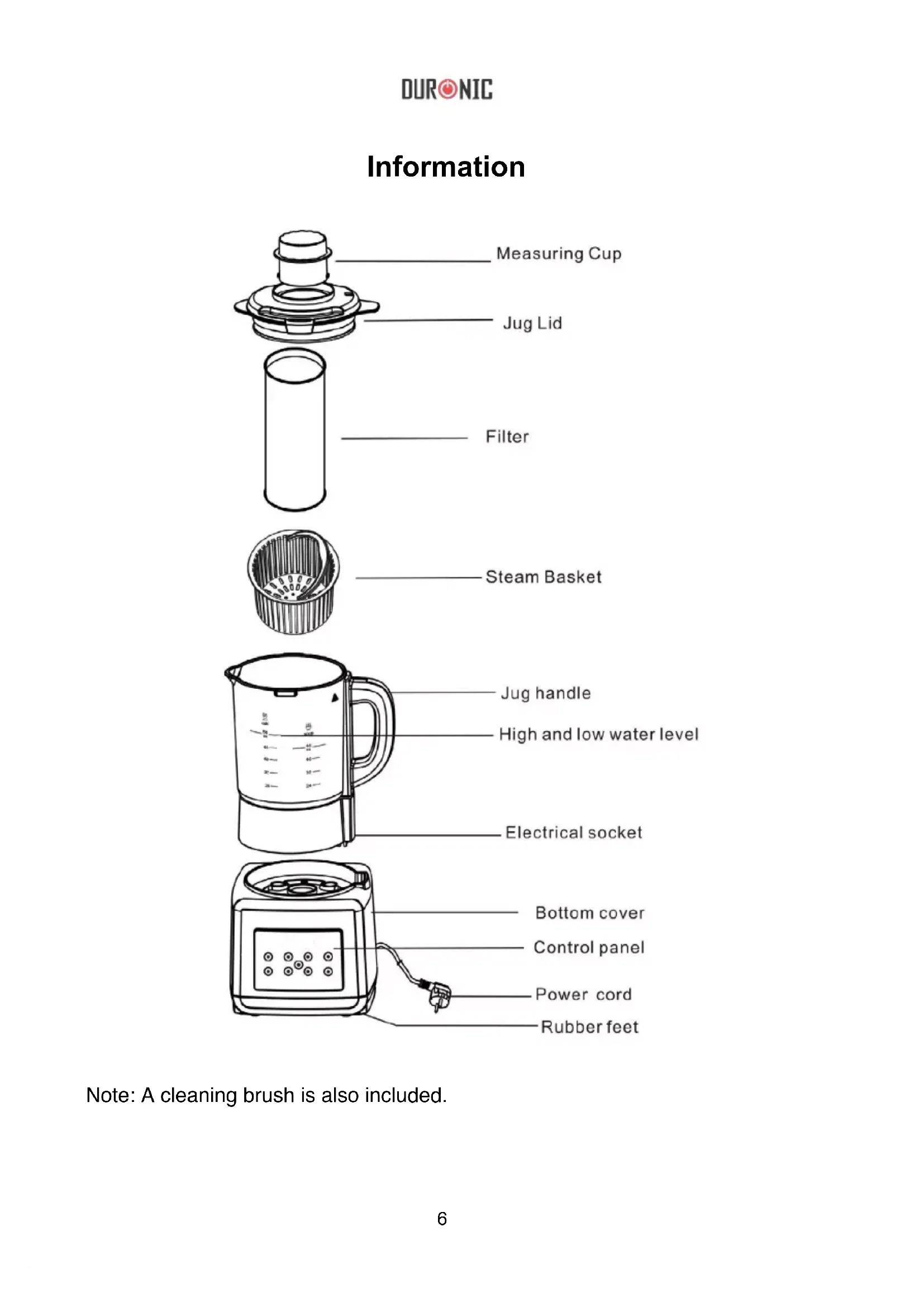 rotating blades. Blender function Keep warm function 2 soup type settings Audible warnings Locking lid with food chute Alarm when soup is ready Safety Instructions Getting Started In The Box Remove the soup maker from the box. Remove any packaging from the product. Soup maker power base Soup maker jug with built-in blade Jug lid Measuri ng cup Instruction manual Filter, steam basket Sponge & brush8