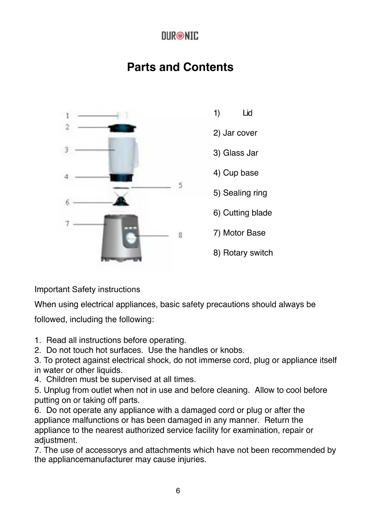 English Manual6 Parts and Contents Important Safety instructions When using electrical appliances, basic safety precautions should always be followed, including the following: