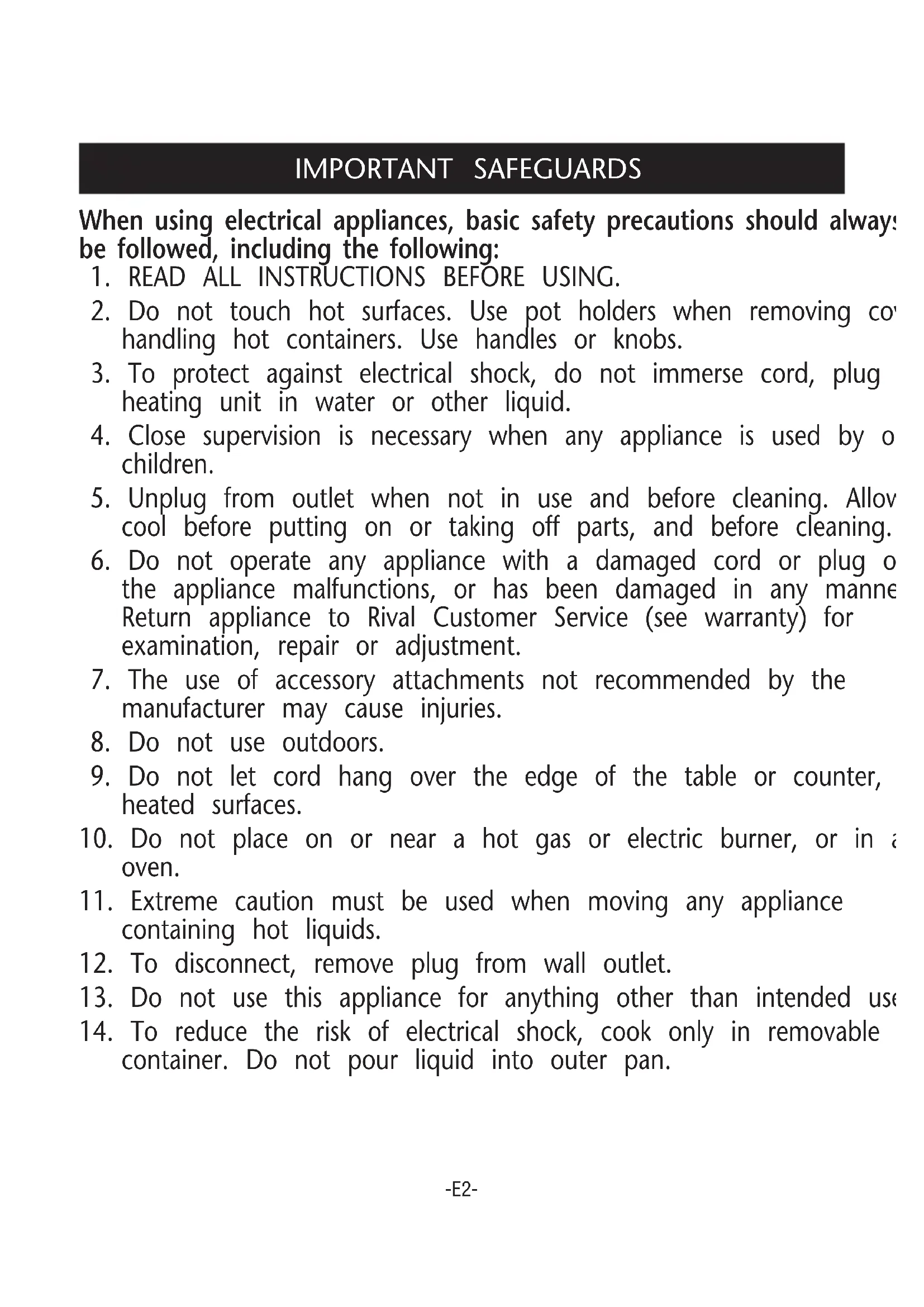 container. Do not pour liquid into outer pan.SAVE THESE INSTRUCTIONS This appliance is for HOUSEHOLD USE ONLY. No user-serviceable parts inside. Power Unit never needs lubrication. Do not attempt to service this product. A short power supply cord is provided to reduce the risk resulting from becoming entangled in or tripping over a longer cord. An extension cord may be used if care is exercised in its use. If an extension cord is used the marked electrical rating of the extension cord should be at least as great as the electrical rating of the RICE COOKER. The cord should be arranged so that it will not drape over the countertop or table top where it can be pulled on by children or tripped over unintentionally. Do not immerse base in water or other liquids. No liability can be accepted for any damage caused by non-compliance with these instructions or any other improper use or mishandling. -E3- Congratulations on the purchase of your new RICE COOKER! You are now the proud owner of an extremely versatile appliance. You can expect perfect rice every time as well as prepare great soups and stews, steam vegetables and even bake a cake! Be sure to visit the Rival web site at www.rivalproducts.com for more about your RICE COOKER and the many different ways you can use it! POLARIZED PLUG This appliance has a polarized plug (one blade is wider than the other). To reduce the risk of electric shock, this plug is intended to fit into a polarized outlet only one way. If the plug does not fit fully into the outlet, reverse the plug. If it still does not fit, contact a qualified electrician. Do not attempt to modify the plug in any way. If the plug fits loosely into the AC outlet or if the AC outlet feels warm do not use that outlet.ADDITIONAL IMPORTANT SAFEGUARDS