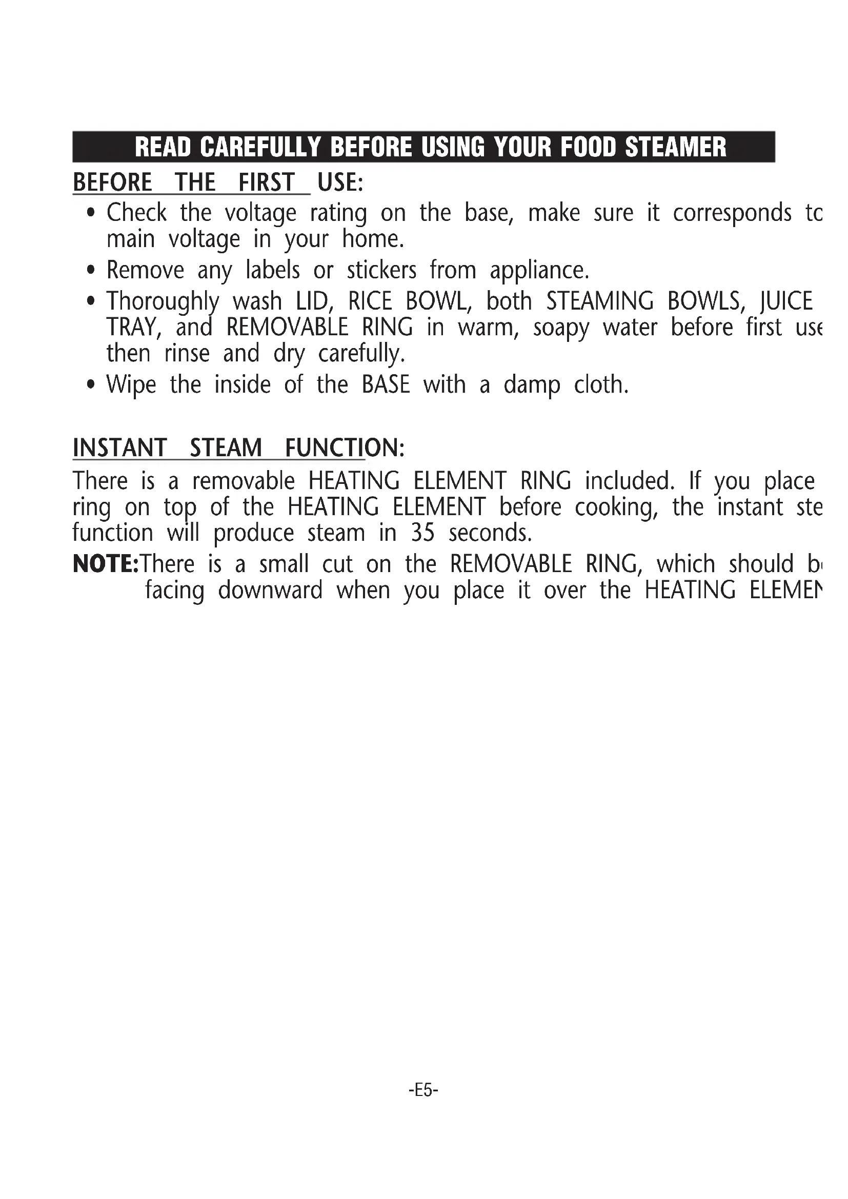 Wipe the inside of the BASE with a damp cloth. INSTANT STEAM FUNCTION: There is a removable HEATING ELEMENT RING included. If you place this ring on top of the HEATING ELEMENT before cooking, the instant steam function will produce steam in 35 seconds. NOTE: There is a small cut on the REMOVABLE RING, which should be facing downward when you place it over the HEATING ELEMENT. READ CAREFULLY BEFORE USING YOUR FOOD STEAMER-E6-