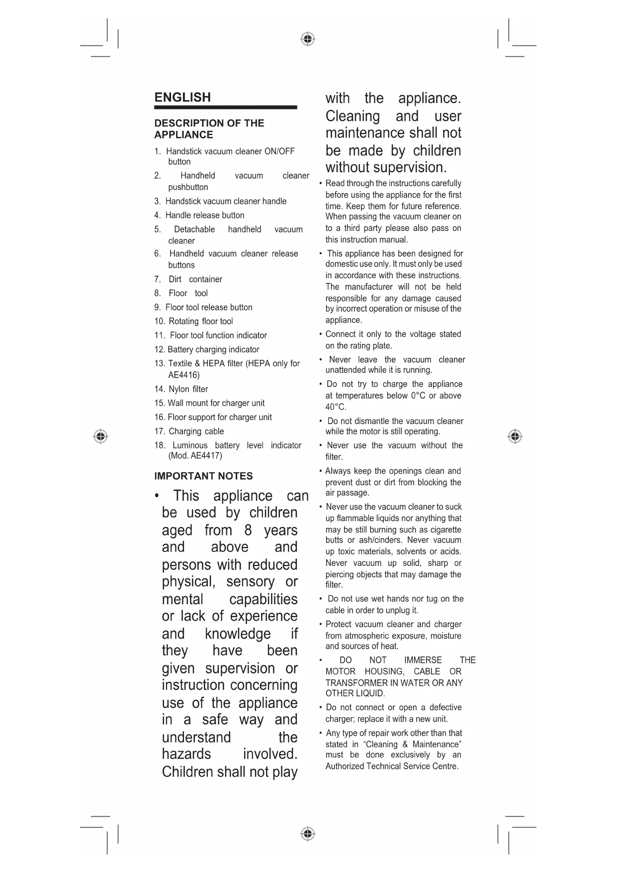 THE BATTERIES: To protect the environment, never put this product in with household rubbish at the end of its life time. This appliance contains Ni-MH batteries that must be taken out of the appliance for recycling. Do the following to remove the batteries: With the help of a small screwdriver, remove the battery cover on the back of the hand vacuum, Figure 23. For AE4417, use the screwdriver to remove all the screws on the hand vacuum. On the inside you will find that the batteries are soldered into the appliance. Pull the battery pack out and cut the cables with scissors, Figure 24. Deposit the batteries in the special containers provided by your local authorities. Similarly, to dispose of the appliance at the end of its useful life, you can take it to an authorized technical service centre. ADVICE ON DISPOSAL: Our goods come in optimised packaging. This basically consists in using non-contaminating materials which should be handed over to the local waste disposal service as secondary raw materials. This product complies with EU Directive 2002/96/CE. The crossed wheelie bin symbol shown on the appliance indicates that when it comes to dispose of the product it must not be included in with household refuse. It must be taken to a special refuse collection point for electric and electronic appliances or returned to the distributor when purchasing a similar appliance. Under current refuse disposal regulations, users who fail to take discarded appliances to special refuse collection points may be penalised. Correct disposal of discarded appliances means that they can be recycled and processed ecologically, helping the environment and allowing materials used in the product to be reused. For more information on available waste disposal schemes contact your local refuse service or the shop where the product was purchased. Manufacturers and importers are responsible for ecological recycling, processing and disposal of products, whether directly or via a public system. Your local town council can provide you with information about how to dispose of obsolete appliances.FRANÇAIS DESCRIPTION DE L’APPAREIL