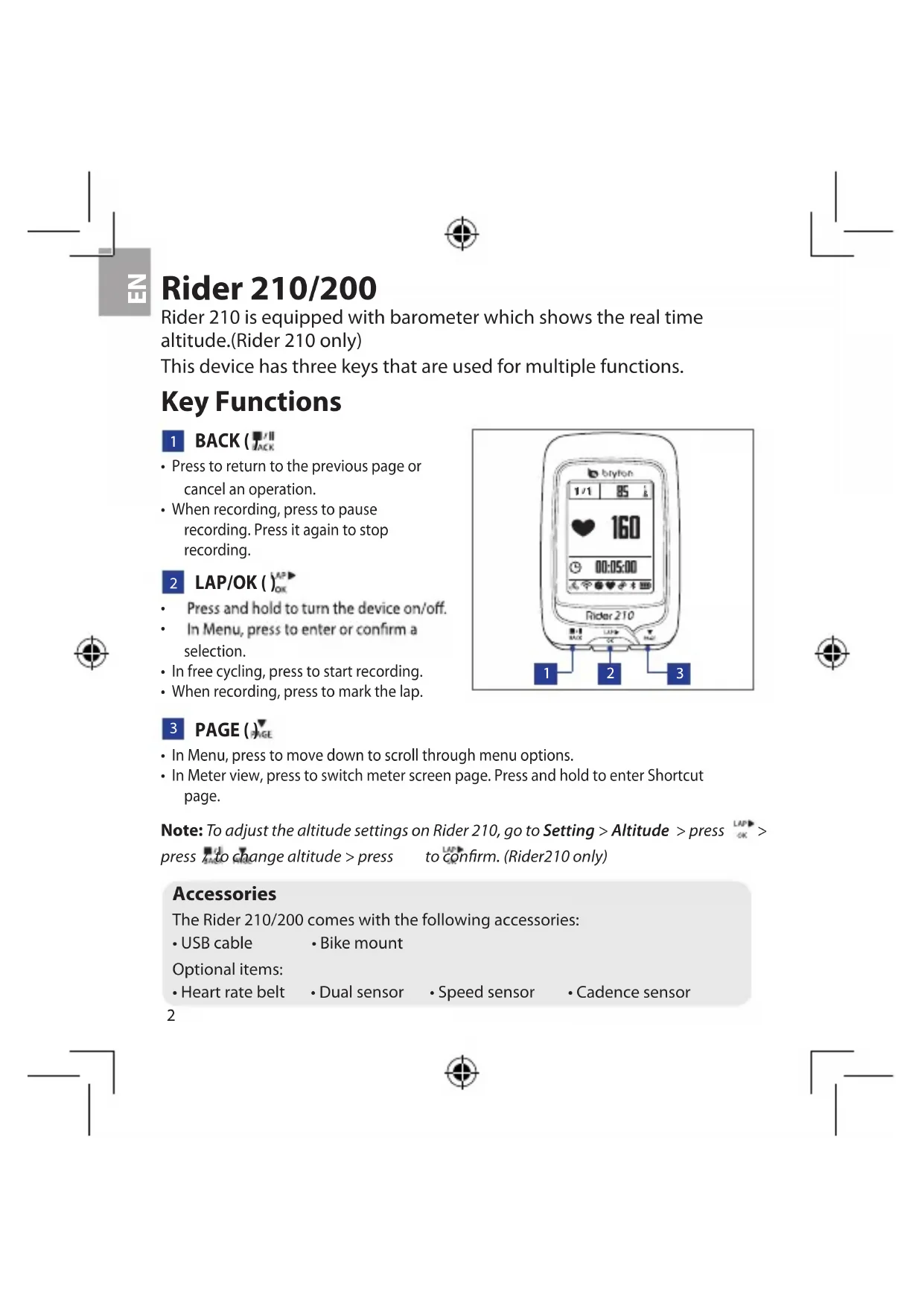 PAGE ( ) t In Menu, press to move down to scroll through menu options.t In Meter view, press to switch meter screen page. Press and hold to enter Shortcut page. Accessories The Rider 210/200 comes with the following accessories:t64#DBCMFt#JLFNPVntOptional items: t)FBrt ratFCFMUtDVBMTFOTPSt4QFFETFOTPStCadence sensor