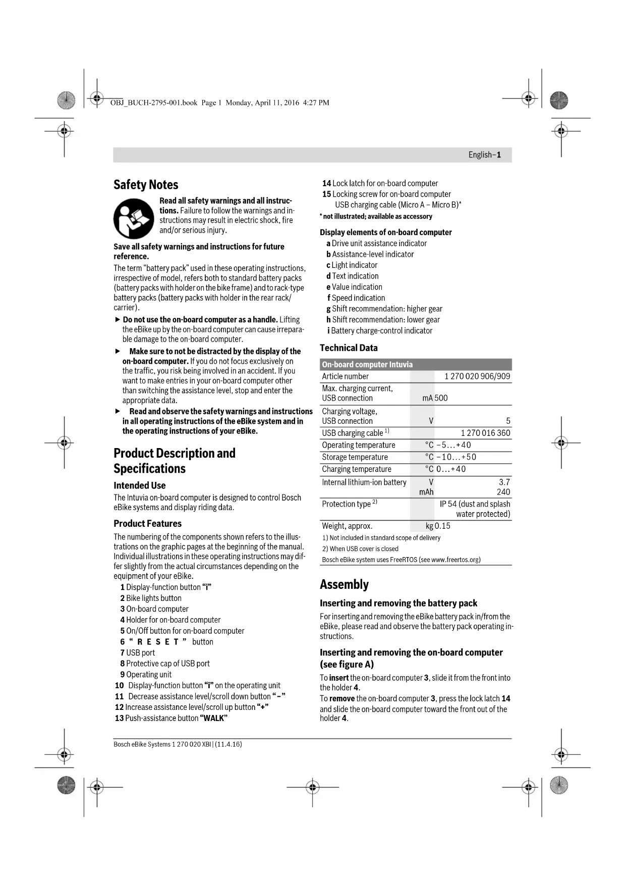IP 54 (dust and splash water protected) Weight, approx. kg 0.15 1) Not included in standard scope of delivery2) When USB cover is closedBosch eBike system uses FreeRTOS (see www.freertos.org) OBJ_BUCH-2795-001.book Page 1 Monday, April 11, 2016 4:27 PMEnglish–2 1 270 020 XBI | (11.4.16) Bosch eBike Systems Remove the on-board computer when you park the eBike. It is possible to secure the on-board computer against remov- al in the holder. To do so, remove the holder 4 from the han- dlebar. Put the on-board computer in the holder. Screw the locking screw 15 (thread M3, 8 mm long) from below into the thread provided in the holder. Mount the holder back onto the handlebar. Operation Initial Operation Requirements The eBike system can only be activated when the following requirements are met: – A sufficiently charged battery pack is inserted (see battery pack operating instructions). – The on-board computer is properly inserted in the holder (see “Inserting and removing the on-board computer”, page English–1). – The speed sensor is connected properly (see drive unit operating instructions). Switching the eBike System On/Off Options for switching on the eBike system: – If the on-board computer is already switched on when you insert it into the holder, then the eBike system will be switched on automatically. – When the on-board computer and the eBike battery pack are inserted, briefly press the On/Off button 5 of the on- board computer. – When the on-board computer is inserted, press the On/Off button of the eBike battery pack (see battery pack operat- ing instructions). The drive is activated as soon as you step on the pedals (ex- cept for in the push assistance function or in assistance level “OFF”). The motor output depends on the settings of the as- sistance level on the on-board computer. As soon as the sys- tem is activated, “Active Line/Performance Line” will ap- pear briefly on the display. As soon as you stop pedaling when in normal operation, or as soon as you have reached a speed of 25/45 km/h, the assis- tance from the eBike drive is switched off. The drive is auto- matically re-activated as soon you start pedaling again and the speed is below 25/45 km/h. Options for switching off the eBike system: – Press the On/Off button 5 of the on-board computer. – Switch the eBike battery pack off by its On/Off button (see battery pack operating instructions). – Remove the on-board computer out of its holder. If the eBike is not moved and no button is pressed on the on- board computer for 10 minutes, the eBike system will shut down automatically in order to save energy. eShift (optional) eShift is the integration of automatic gear shifting systems in- to the eBike system. To support the rider in the best way pos- sible, the function indications and the basic settings menu have been adapted for the “eShift” function. eShift with NuVinci H|Sync The optimum gear for the respective speed is automatically set according to a pre-defined desired cadence. In manual mode you can choose between multiple gears. In the “NuVinci Cadence” mode you can use the “–” or “+” button on the operating unit to increase or decrease the desired cadence. If you hold down the “–” or “+” button, the cadence will increase or decrease in steps of five. The desired cadence is shown on the display. In the “NuVinci Gear” mode you can use the “–” or “+” button on the operating unit to switch back and forth between several defined transmission ratios. The engaged transmis- sion ratio (gear) is shown on the display. eShift with SRAM DD3 Pulse The gear hub of the SRAM DD3 Pulse works on a speed-de- pendent basis. Regardless of which gear is engaged on the de- railleur gears, one of the three gears of the gear hub will auto- matically be engaged “Gear: Auto”. The engaged gear will be shown briefly on the display when- ever the gear of the gear hub is shifted. If the eBike is brought to a standstill from a speed of more than 10 km/h, the system can automatically switch back to a set “Start gear”. The “Start gear” can be set in the basic set- tings menu (see “Displaying/Adapting Basic Settings”, page English–5). In the “Gear” mode you can use the “–” or “+” button on the operating unit to switch back and forth between several defined transmission ratios. The engaged transmission ratio (gear) is shown on the display. In the “Gear” manual mode, the system can also automati- cally switch back to a set “Start gear”. The drive unit recognises the gear shift and briefly reduces the motor assistance level as a result of it, which means the gear can also be shifted at any time under load or on a hill. eShift with Shimano Di2 For Shimano eShift you use the Shimano control lever to shift gears. The engaged gear will be shown briefly on the display when- ever the gear of the gear hub is shifted. The drive unit recognises the gear shift and briefly reduces the motor assistance level as a result of it, which means the gear can also be shifted at any time under load or on a hill. If the eBike is brought to a standstill from a speed of more than 10 km/h, the system can automatically switch back to a set “Start gear”. The “Start gear” can be set in the basic set- tings menu (see “Displaying/Adapting Basic Settings”, page English–5). OBJ_BUCH-2795-001.book Page 2 Monday, April 11, 2016 4:27 PMEnglish–3 Bosch eBike Systems 1 270 020 XBI | (11.4.16) Displays and configurations of the on-board computer Energy supply of the on-board computer If the on-board computer is in the holder 4, a sufficiently charged battery pack is inserted in the eBike and the eBike system is turned on, then the on-board computer is powered by the battery pack of the eBike. If the on-board computer is removed from the holder 4, the energy is supplied via an internal battery pack. If the internal battery pack is weak when the on-board computer is s