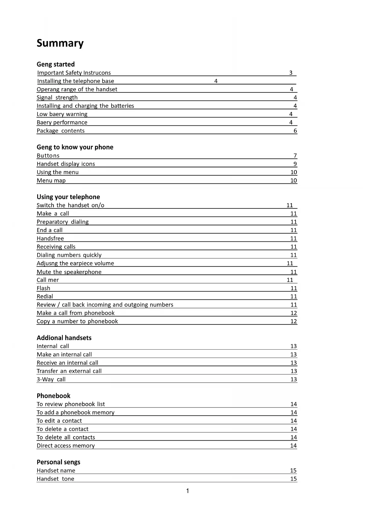 Please read and retain this instruction For instruction manual in another language, check online at http://www.thomsonphones.eu1 Summary Getting started Important Safety Instructions 3 Installing the telephone base 4 Operating range of the handset 4 Signal strength 4 Installing and charging the batteries 4 Low battery warning 4 Battery performance 4 Package contents 6 Getting to know your phone Buttons 7 Handset display icons 9 Using the menu 10 Menu map 10 Using your telephone Switch the handset on/off 11 Make a call 11 Preparatory dialing 11 End a call 11 Handsfree 11 Receiving calls 11 Dialing numbers quickly 11 Adjusting the earpiece volume 11 Mute the speakerphone 11 Call timer 11 Flash 11 Redial 11 Review / call back incoming and outgoing numbers 11 Make a call from phonebook 12 Copy a number to phonebook 12 Additional handsets Internal call 13 Make an internal call 13 Receive an internal call 13 Transfer an external call 13 3-Way call 13 Phonebook To review phonebook list 14 To add a phonebook memory 14 To edit a contact 14 To delete a contact 14 To delete all contacts 14 Direct access memory 14 Personal settings Handset name 15 Handset tone 152 Language 15 Auto Hang-up 15 Clock & Alarm Date & time 16 Set date & time format 16 Set the alarm 16 Set the alarm tone 16 Advanced settings Change system PIN 17 Registration 17 De-registration 17 Restore factory default 17 Set prefix number 17 Flash time 18 Dial mode 18 First ring 18 Using the answering machine (TAM) Switch the answering machine on/off 19 Set an answer mode 19 Play, record and delete OGMs 19 Listening to your messages 19 Delete an answering messages 19 Delete all answering messages 20 Ring delay 20 Remote access 20 Select a language for answering machine 20