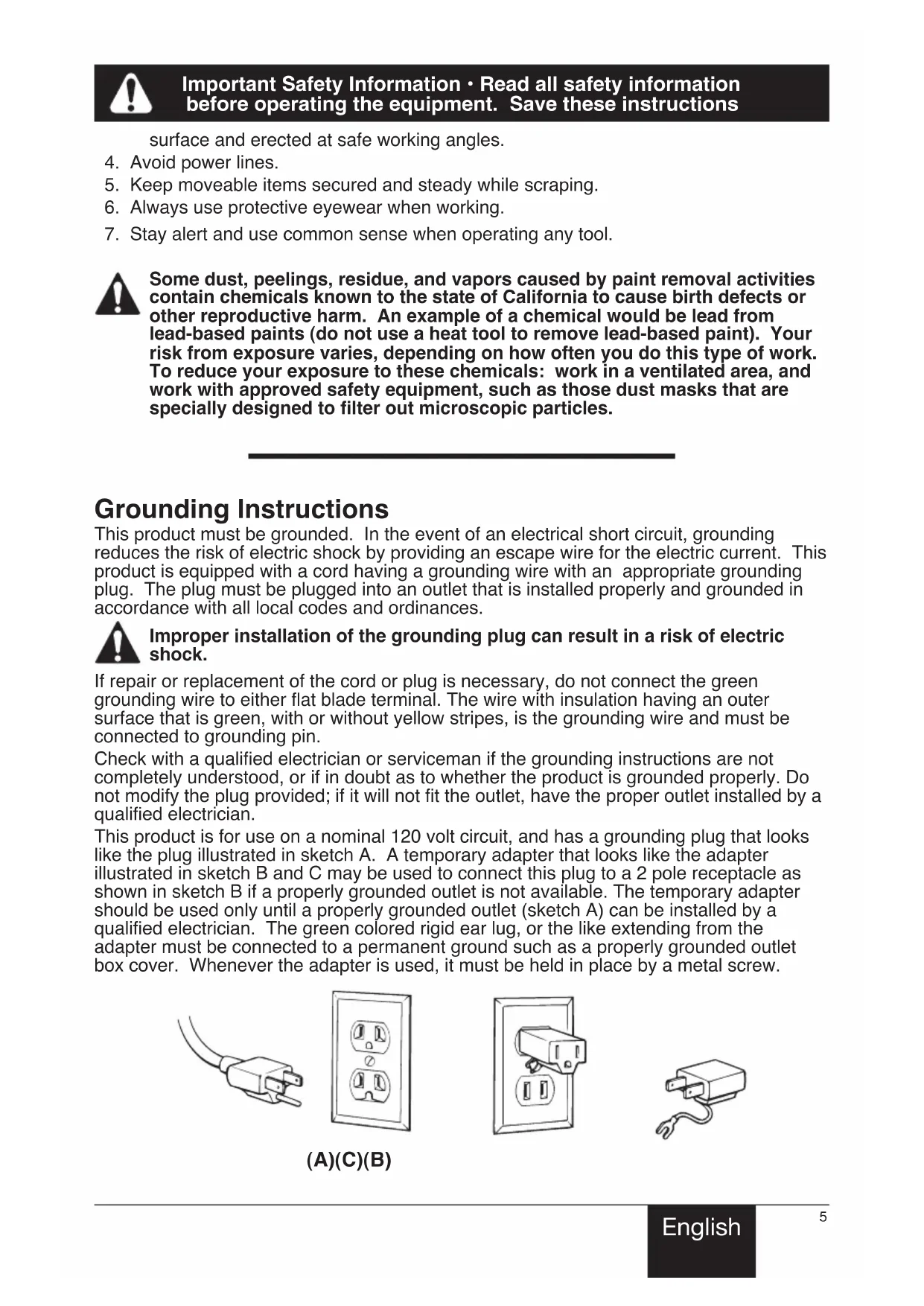 This product is for use on a nominal 120 volt circuit, and has a grounding plug that looks like the plug illustrated in sketch A. A temporary adapter that looks like the adapter illustrated in sketch B and C may be used to connect this plug to a 2 pole receptacle as shown in sketch B if a properly grounded outlet is not available. The temporary adapter should be used only until a properly grounded outlet (sketch A) can be installed by a qualified electrician. The green colored rigid ear lug, or the like extending from the adapter must be connected to a permanent ground such as a properly grounded outlet box cover. Whenever the adapter is used, it must be held in place by a metal screw.