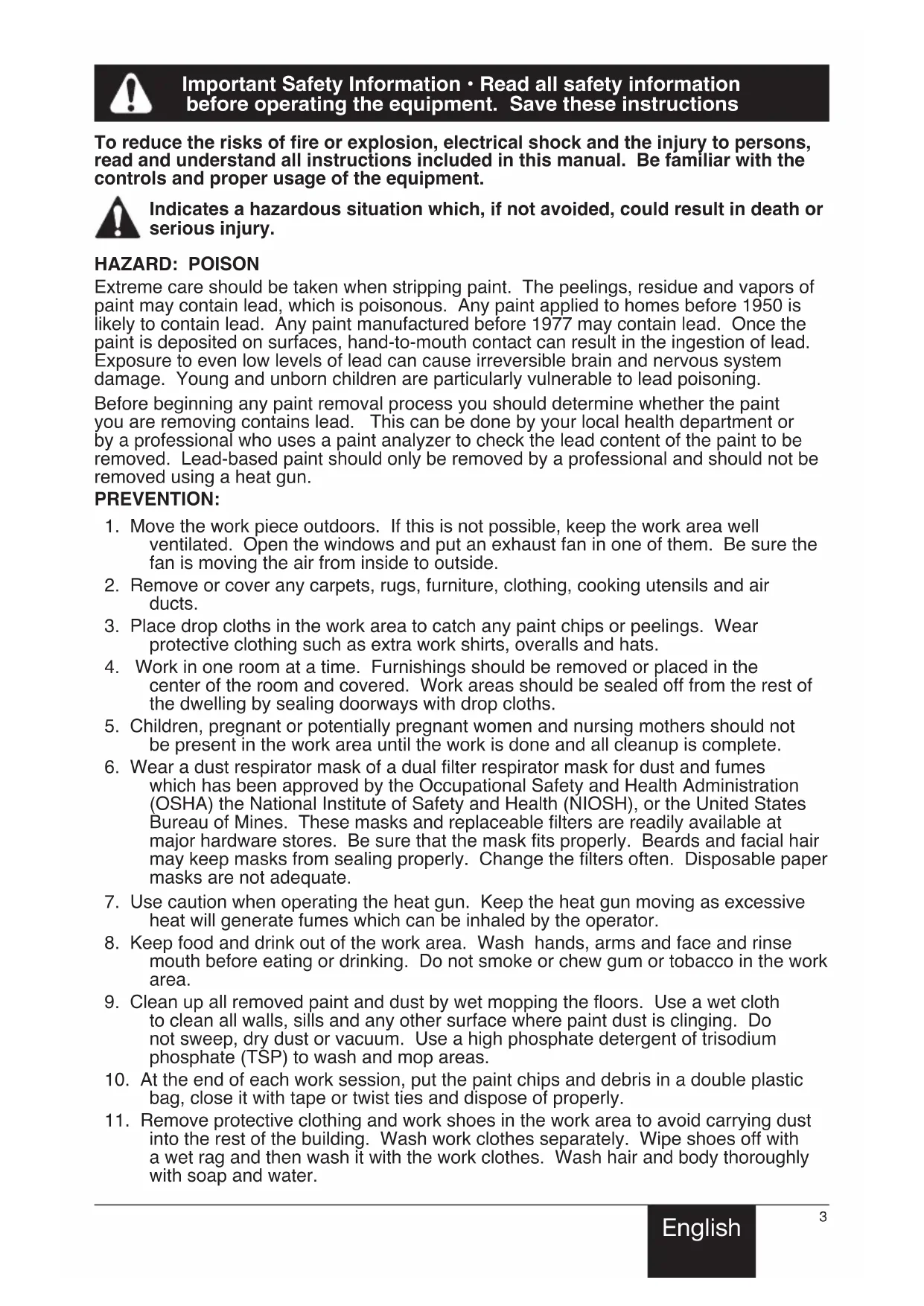 This heat gun is a quality power tool. Like any power tool, it can be dangerous when misused. Read the following instructions carefully and follow all safety precautions. It is the responsibility of the owner to use the heat gun properly.