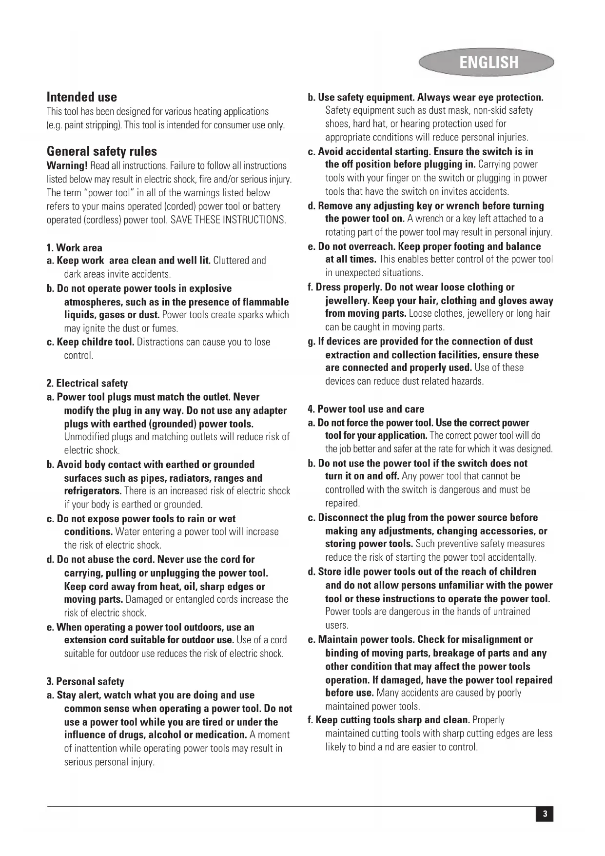 g. Use the power tool, accessories and tool bits etc., in accordance with these instructions and in the manner intended for the particular type of power tool, taking into account the working conditions and the work to be performed. Use of the power tool for operations different from those intended could result in a hazardous situation.