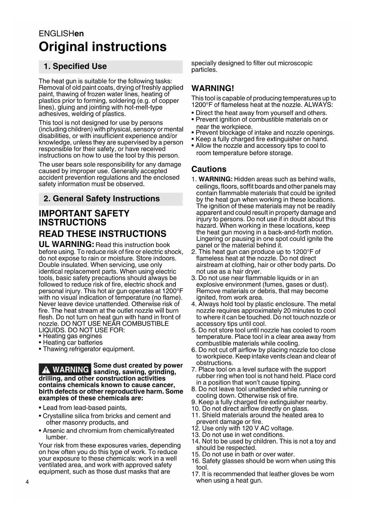 Original instructions The heat gun is suitable for the following tasks: Removal of old paint coats, drying of freshly applied paint, thawing of frozen water lines, heating of plastics prior to forming, soldering (e.g. of copper lines), gluing and jointing with hot-melt-type adhesives, welding of plastics. This tool is not designed for use by persons (including children) with physical, sensory or mental disabilities, or with insufficient experience and/or knowledge, unless they are supervised by a person responsible for their safety, or have received instructions on how to use the tool by this person. The user bears sole responsibility for any damage caused by improper use. Generally accepted accident prevention regulations and the enclosed safety information must be observed. IMPORTANT SAFETY INSTRUCTIONS