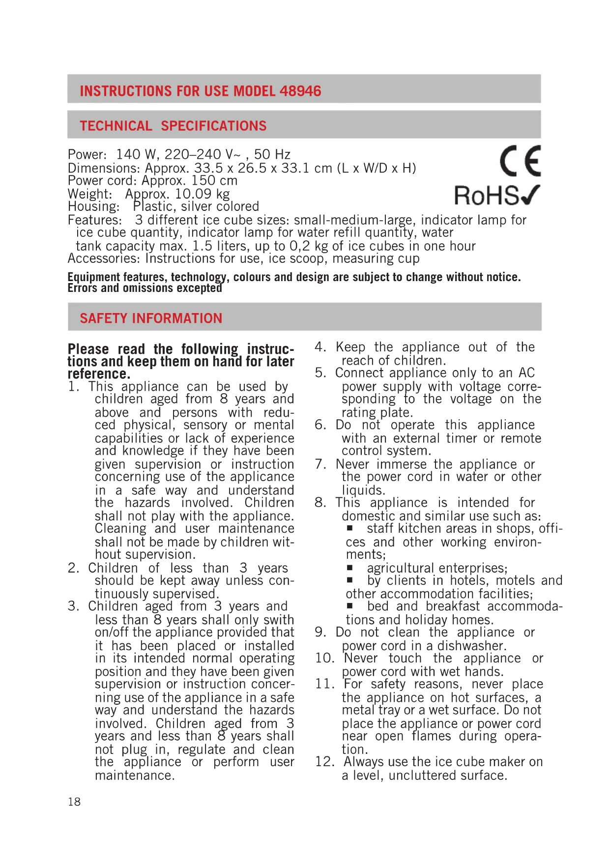 ice cube maker in a dry, safe place so that it is protected from dust, shocks, heat and mois-ture.22 TROUBLESHOOTING Problem Cause Solution The compressor hums very loudly. The voltage is too low. Switch off the appliance and check whether it is connected to a 220– 240 V~ wall socket. Indicator lamp shows that the ice container is full, even though it is not full. The room temperature is too cool. Remove the ice container and push it back into the appliance. Pieces of ice are jammed. Switch the appliance off. Empty the ice container and restart the appliance. If the problem persists, contact our customer service department. The sensor is defective. Contact our customer service department. Indicator lamp shows that the water level is too low, even though there is enough water. The water is not conductive enough. Add a pinch of salt to the water in the water tank. Indicator lamp for low water level is out, even though there is no water in the tank. The water is not conductive enough. Switch the appliance off. Clean the water tank thoroughly and restart the appliance. The sensor is defective. Contact our customer service department. No indicator lamp lights up when you plug the appliance into the wall socket. The appliance is not connected correctly. Check to make sure that the plug was inserted correctly into the wall socket. A component is defective. Contact our customer service department. The indicator lamps for insufficient water and full ice container blink red at the same time. An oversized ice cube is blocking the evaporator. Switch the appliance off. Wait until the ice has melted. Start the appliance again and select a smaller ice cube size. The motor in the appliance is defective. Contact our customer service department. The appliance is working, but does not make ice. Coolant is leaking. Contact our customer service department.23 GUARANTEE CONDITIONS