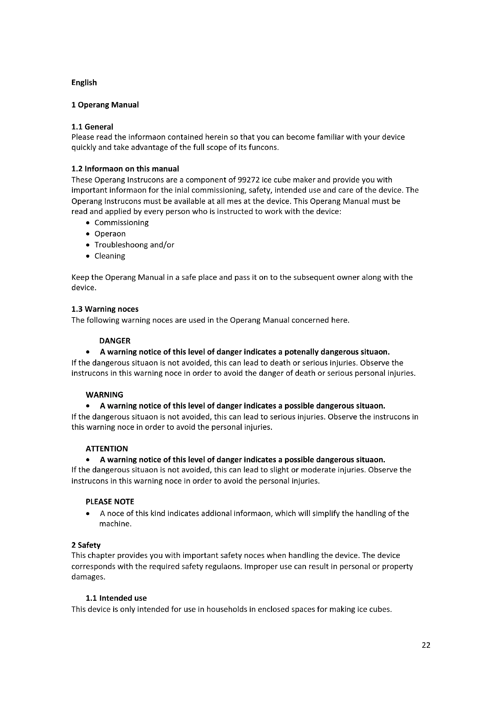 These Operang Instrucons are a component of 99272 ice cube maker and provide you with important informaon for the initial commissioning, safety, intended use and care of the device. The Operang Instrucons must be available at all mes at the device. This Operang Manual must be read and applied by every person who is instructed to work with the device: