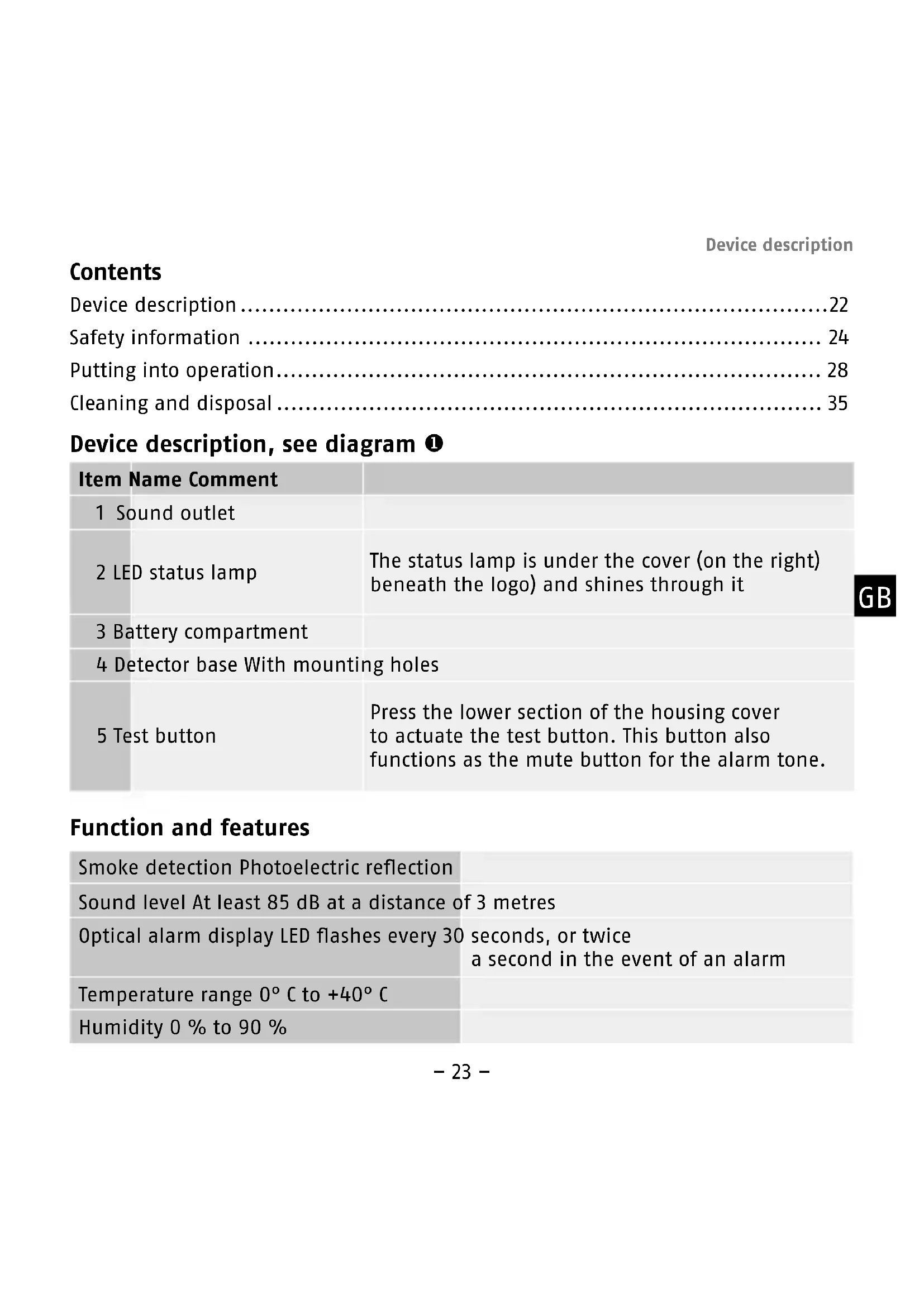 - Cleaning and disposal Device description, see diagram Function and features Item Name Comment 1 Sound outlet 2 LED status lamp The status lamp is under the cover (on the right) beneath the logo) and shines through it 3 Battery compartment 4 Detector base With mounting holes 5 Test button Press the lower section of the housing cover to actuate the test button. This button also functions as the mute button for the alarm tone. Smoke detection Photoelectric reection Sound level At least 85 dB at a distance of 3 metres Optical alarm display LED ashes every 30 seconds, or twice a second in the event of an alarm Temperature range 0° C to +40° C Humidity 0 % to 90 % Device description GB– 24 – The manufacturer reserves the right to make technical modications at any time. Scope of delivery p. 35