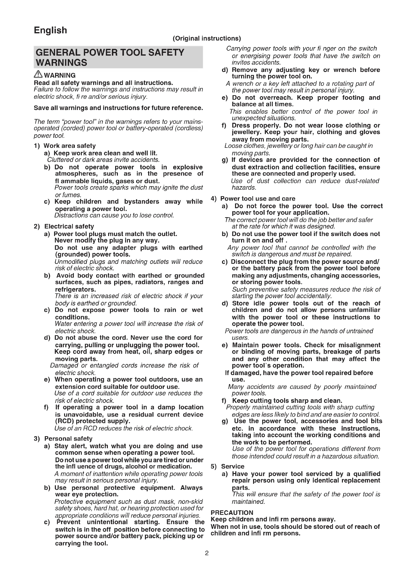 a) Have your power tool serviced by a qualifi ed repair person using only identical replacement parts. This will ensure that the safety of the power tool is maintained. PRECAUTION Keep children and infi rm persons away. When not in use, tools should be stored out of reach of children and infi rm persons.