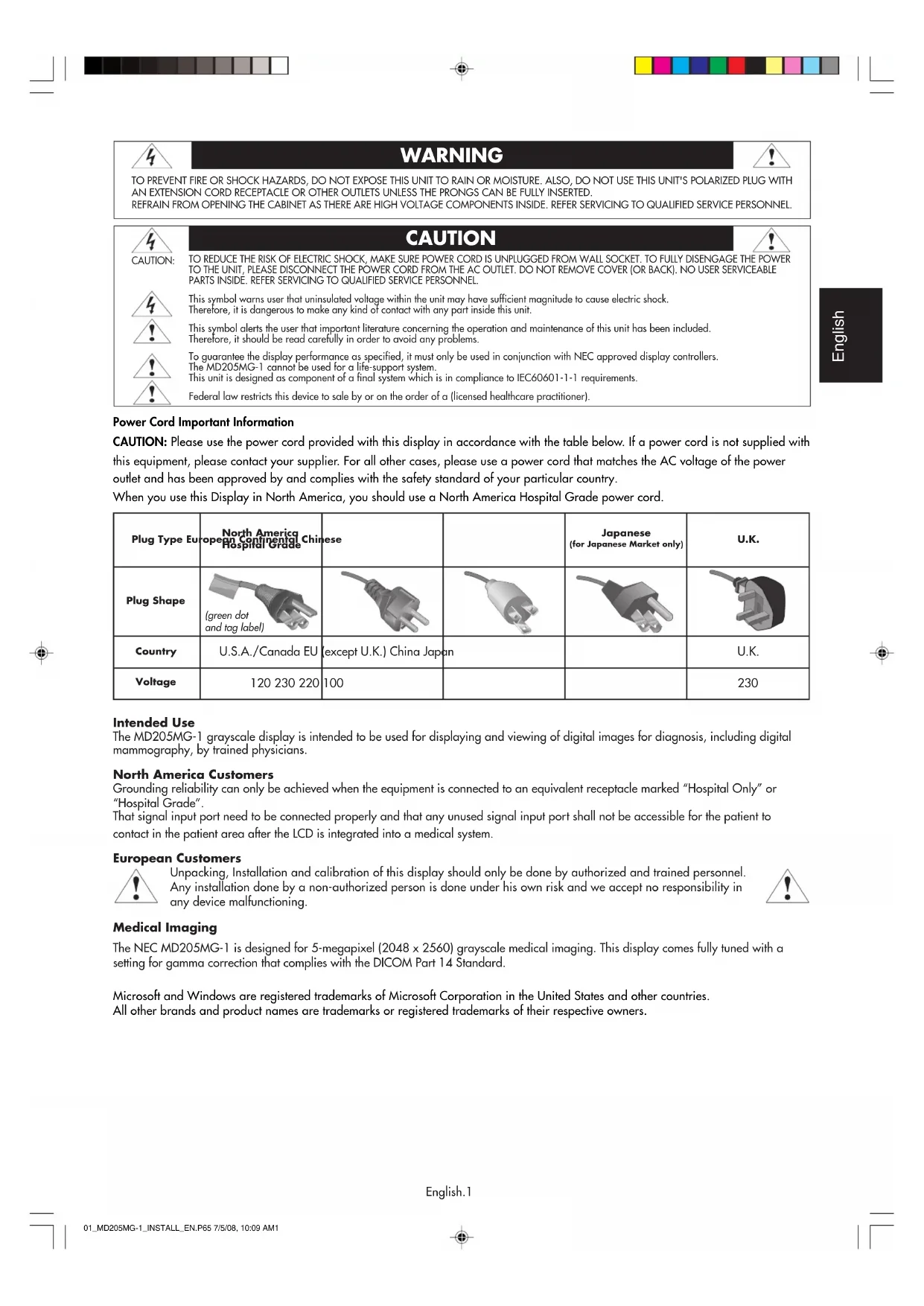 1200_MD205MG-1_INSTALLCOVER.P65 7/5/08, 10:09 AM8EnglishEnglish EnglishEnglish English DeutschDeutsch DeutschDeutsch Deutsch FrançaisFrançais FrançaisFrançais Français 01A_ChapterOpener 7/5/08, 10:09 AM101A_ChapterOpener 7/5/08, 10:09 AM2English.1 English Power Cord Important Information CAUTION: Please use the power cord provided with this display in accordance with the table below. If a power cord is not supplied with this equipment, please contact your supplier. For all other cases, please use a power cord that matches the AC voltage of the power outlet and has been approved by and complies with the safety standard of your particular country. When you use this Display in North America, you should use a North America Hospital Grade power cord. Intended Use The MD205MG-1 grayscale display is intended to be used for displaying and viewing of digital images for diagnosis, including digital mammography, by trained physicians. North America Customers Grounding reliability can only be achieved when the equipment is connected to an equivalent receptacle marked “Hospital Only” or “Hospital Grade”. That signal input port need to be connected properly and that any unused signal input port shall not be accessible for the patient to contact in the patient area after the LCD is integrated into a medical system. European Customers Unpacking, Installation and calibration of this display should only be done by authorized and trained personnel. Any installation done by a non-authorized person is done under his own risk and we accept no responsibility in any device malfunctioning. Medical Imaging The NEC MD205MG-1 is designed for 5-megapixel (2048 x 2560) grayscale medical imaging. This display comes fully tuned with a setting for gamma correction that complies with the DICOM Part 14 Standard. Microsoft and Windows are registered trademarks of Microsoft Corporation in the United States and other countries. All other brands and product names are trademarks or registered trademarks of their respective owners. WARNING TO PREVENT FIRE OR SHOCK HAZARDS, DO NOT EXPOSE THIS UNIT TO RAIN OR MOISTURE. ALSO, DO NOT USE THIS UNIT'S POLARIZED PLUG WITH AN EXTENSION CORD RECEPTACLE OR OTHER OUTLETS UNLESS THE PRONGS CAN BE FULLY INSERTED. REFRAIN FROM OPENING THE CABINET AS THERE ARE HIGH VOLTAGE COMPONENTS INSIDE. REFER SERVICING TO QUALIFIED SERVICE PERSONNEL. TO REDUCE THE RISK OF ELECTRIC SHOCK, MAKE SURE POWER CORD IS UNPLUGGED FROM WALL SOCKET. TO FULLY DISENGAGE THE POWER TO THE UNIT, PLEASE DISCONNECT THE POWER CORD FROM THE AC OUTLET. DO NOT REMOVE COVER (OR BACK). NO USER SERVICEABLE PARTS INSIDE. REFER SERVICING TO QUALIFIED SERVICE PERSONNEL. This symbol warns user that uninsulated voltage within the unit may have sufficient magnitude to cause electric shock. Therefore, it is dangerous to make any kind of contact with any part inside this unit. This symbol alerts the user that important literature concerning the operation and maintenance of this unit has been included. Therefore, it should be read carefully in order to avoid any problems. To guarantee the display performance as specified, it must only be used in conjunction with NEC approved display controllers. The MD205MG-1 cannot be used for a life-support system. This unit is designed as component of a final system which is in compliance to IEC60601-1-1 requirements. Federal law restricts this device to sale by or on the order of a (licensed healthcare practitioner). CAUTION CAUTION: Plug Type European Continental Chinese North America Hospital Grade Japanese (for Japanese Market only) Plug Shape Country Voltage