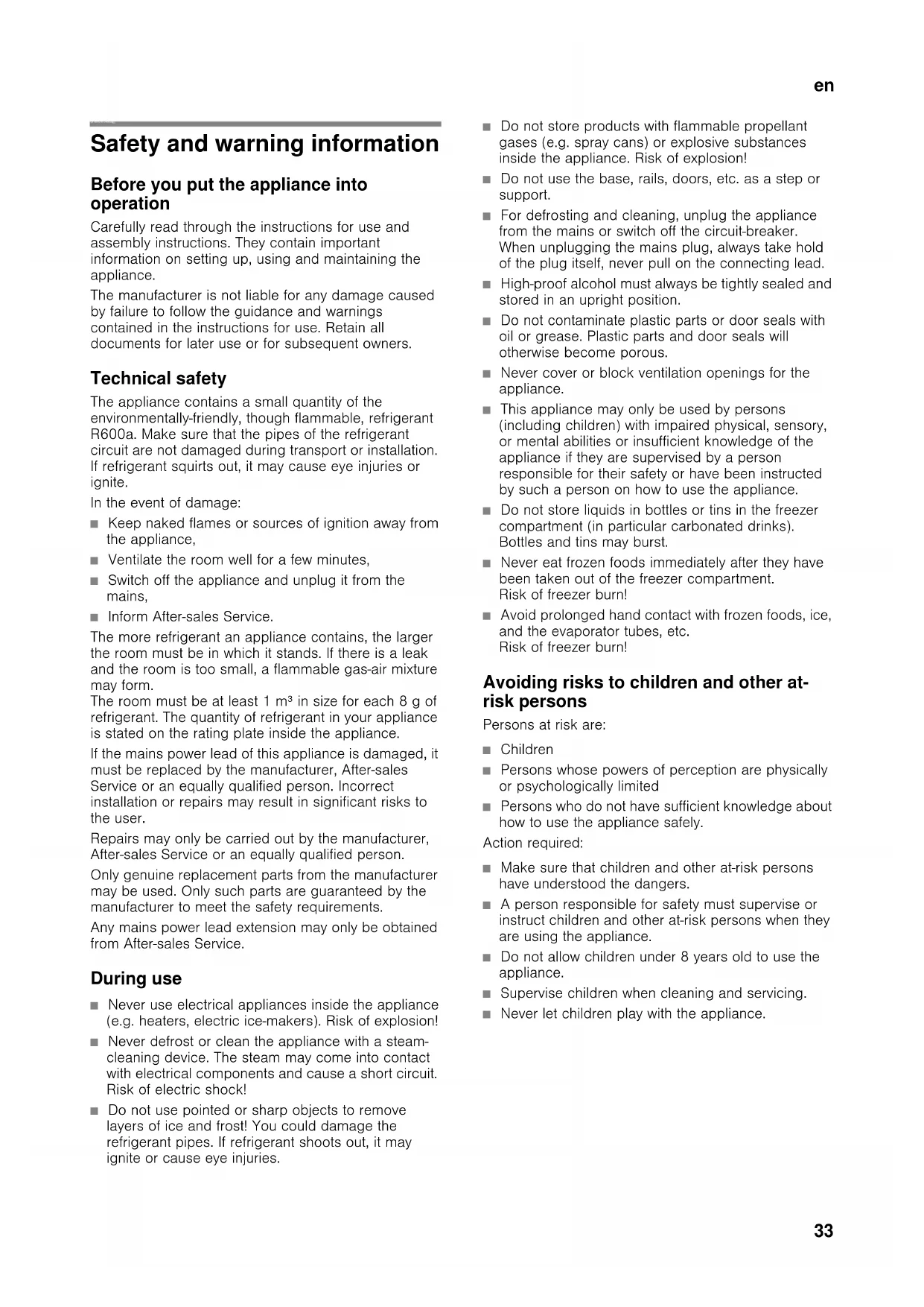 enTable of contents enInstructions for use Safety and warning information Before you put the appliance into operation Carefully read through the instructions for use and assembly instructions. They contain important information on setting up, using and maintaining the appliance. The manufacturer is not liable for any damage caused by failure to follow the guidance and warnings contained in the instructions for use. Retain all documents for later use or for subsequent owners. Technical safety The appliance contains a small quantity of the environmentally-friendly, though flammable, refrigerant R600a. Make sure that the pipes of the refrigerant circuit are not damaged during transport or installation. If refrigerant squirts out, it may cause eye injuries or ignite. In the event of damage: ■ Keep naked flames or sources of ignition away from the appliance, ■ Ventilate the room well for a few minutes, ■ Switch off the appliance and unplug it from the mains, ■ Inform After-sales Service. The more refrigerant an appliance contains, the larger the room must be in which it stands. If there is a leak and the room is too small, a flammable gas-air mixture may form. The room must be at least 1 m³ in size for each 8 g of refrigerant. The quantity of refrigerant in your appliance is stated on the rating plate inside the appliance. If the mains power lead of this appliance is damaged, it must be replaced by the manufacturer, After-sales Service or an equally qualified person. Incorrect installation or repairs may result in significant risks to the user. Repairs may only be carried out by the manufacturer, After-sales Service or an equally qualified person. Only genuine replacement parts from the manufacturer may be used. Only such parts are guaranteed by the manufacturer to meet the safety requirements. Any mains power lead extension may only be obtained from After-sales Service. During use ■ Never use electrical appliances inside the appliance (e.g. heaters, electric ice-makers). Risk of explosion! ■ Never defrost or clean the appliance with a steam- cleaning device. The steam may come into contact with electrical components and cause a short circuit. Risk of electric shock! ■ Do not use pointed or sharp objects to remove layers of ice and frost! You could damage the refrigerant pipes. If refrigerant shoots out, it may ignite or cause eye injuries. ■ Do not store products with flammable propellant gases (e.g. spray cans) or explosive substances inside the appliance. Risk of explosion! ■ Do not use the base, rails, doors, etc. as a step or support. ■ For defrosting and cleaning, unplug the appliance from the mains or switch off the circuit-breaker. When unplugging the mains plug, always take hold of the plug itself, never pull on the connecting lead. ■ High-proof alcohol must always be tightly sealed and stored in an upright position. ■ Do not contaminate plastic parts or door seals with oil or grease. Plastic parts and door seals will otherwise become porous. ■ Never cover or block ventilation openings for the appliance. ■ This appliance may only be used by persons (including children) with impaired physical, sensory, or mental abilities or insufficient knowledge of the appliance if they are supervised by a person responsible for their safety or have been instructed by such a person on how to use the appliance. ■ Do not store liquids in bottles or tins in the freezer compartment (in particular carbonated drinks). Bottles and tins may burst. ■ Never eat frozen foods immediately after they have been taken out of the freezer compartment. Risk of freezer burn! ■ Avoid prolonged hand contact with frozen foods, ice, and the evaporator tubes, etc. Risk of freezer burn! Avoiding risks to children and other at- risk persons Persons at risk are: ■ Children ■ Persons whose powers of perception are physically or psychologically limited ■ Persons who do not have sufficient knowledge about how to use the appliance safely. Action required: ■ Make sure that children and other at-risk persons have understood the dangers. ■ A person responsible for safety must supervise or instruct children and other at-risk persons when they are using the appliance. ■ Do not allow children under 8 years old to use the appliance. ■ Supervise children when cleaning and servicing. ■ Never let children play with the appliance.en