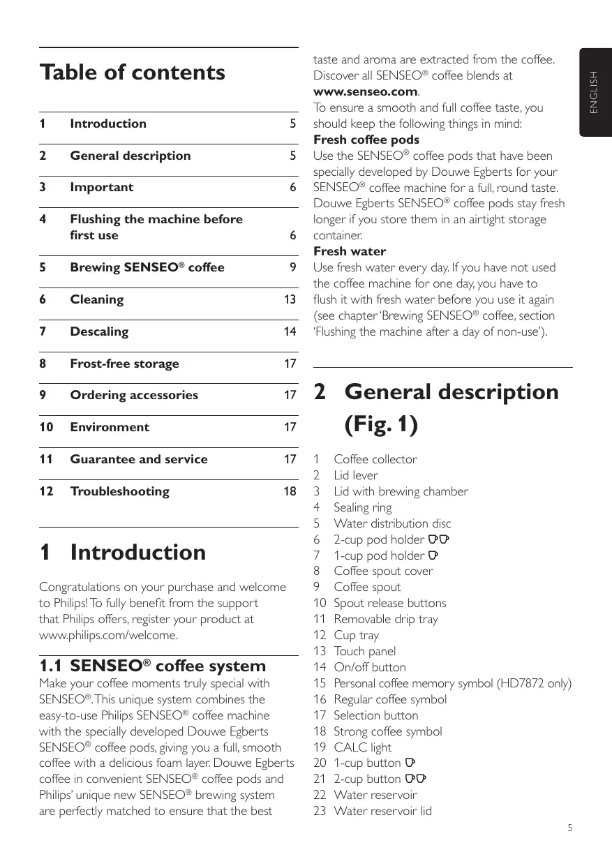 taste and aroma are extracted from the coffee. Discover all SENSEO® coffee blends at www.senseo.com. To ensure a smooth and full coffee taste, you should keep the following things in mind: Fresh coffee pods Use the SENSEO® coffee pods that have been specially developed by Douwe Egberts for your SENSEO® coffee machine for a full, round taste. Douwe Egberts SENSEO® coffee pods stay fresh longer if you store them in an airtight storage container. Fresh water Use fresh water every day. If you have not used the coffee machine for one day, you have to flush it with fresh water before you use it again (see chapter ‘Brewing SENSEO® coffee, section ‘Flushing the machine after a day of non-use’).