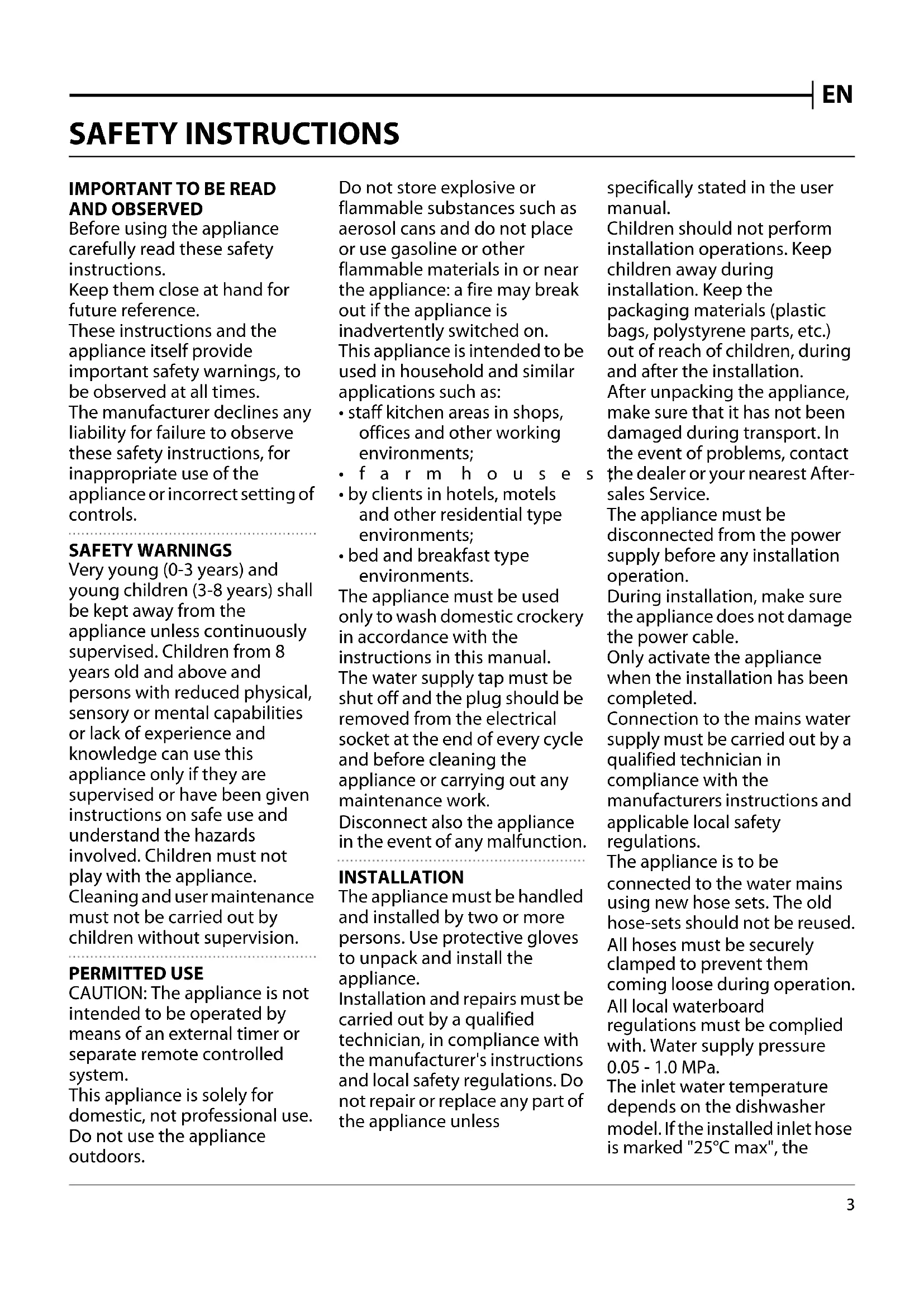 - bed and breakfast type environments. The appliance must be used only to wash domestic crockery in accordance with the instructions in this manual. The water supply tap must be shut off and the plug should be removed from the electrical socket at the end of every cycle and before cleaning the appliance or carrying out any maintenance work. Disconnect also the appliance in the event of any malfunction. INSTALLATION The appliance must be handled and installed by two or more persons. Use protective gloves to unpack and install the appliance. Installation and repairs must be carried out by a qualified technician, in compliance with the manufacturer's instructions and local safety regulations. Do not repair or replace any part of the appliance unless specifically stated in the user manual. Children should not perform installation operations. Keep children away during installation. Keep the packaging materials (plastic bags, polystyrene parts, etc.) out of reach of children, during and after the installation. After unpacking the appliance, make sure that it has not been damaged during transport. In the event of problems, contact the dealer or your nearest After- sales Service. The appliance must be disconnected from the power supply before any installation operation. During installation, make sure the appliance does not damage the power cable. Only activate the appliance when the installation has been completed. Connection to the mains water supply must be carried out by a qualified technician in compliance with the manufacturers instructions and applicable local safety regulations. The appliance is to be connected to the water mains using new hose sets. The old hose-sets should not be reused. All hoses must be securely clamped to prevent them coming loose during operation. All local waterboard regulations must be complied with. Water supply pressure
