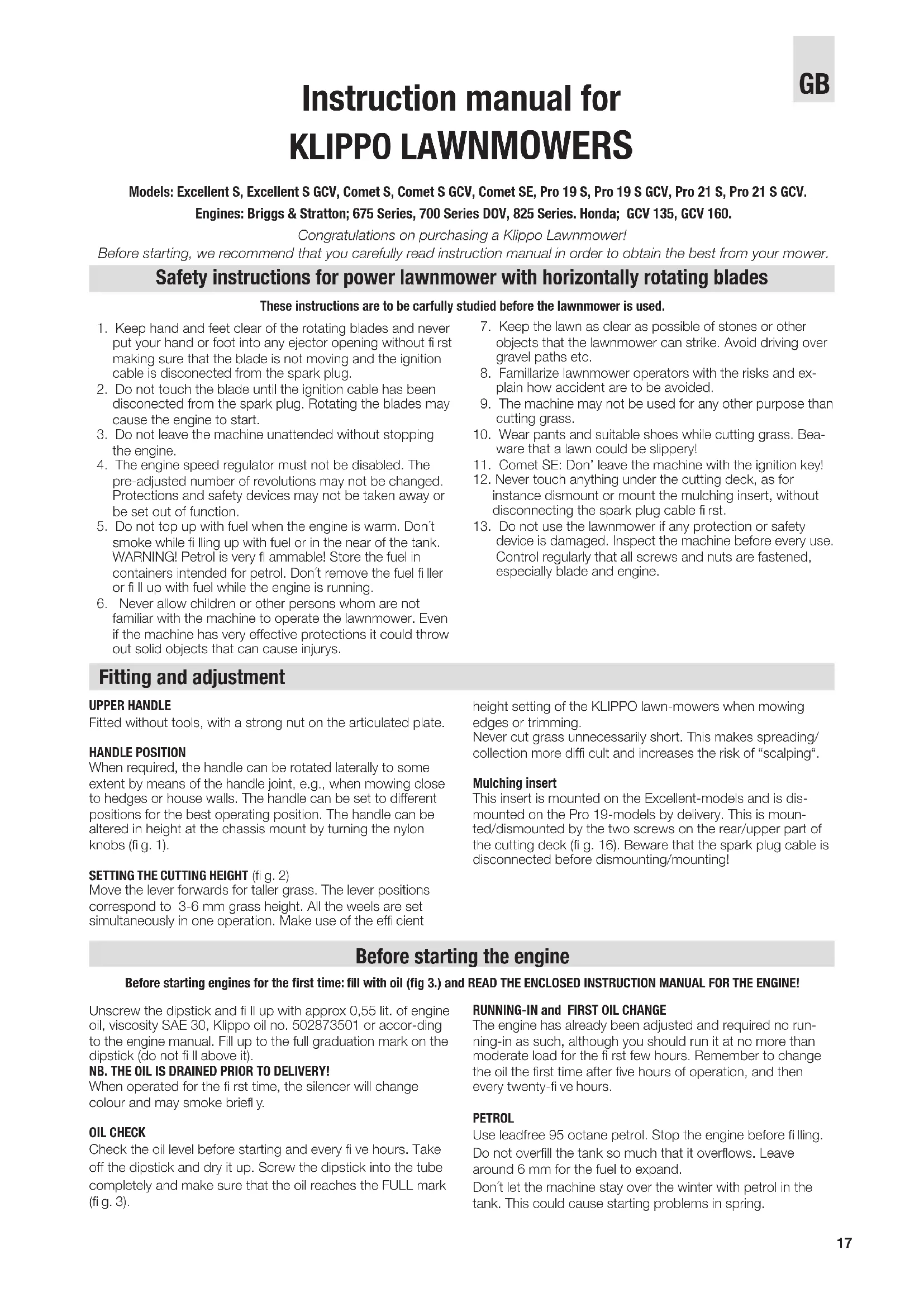 Mitattuäänite hotaso, dB(A) Vahvistettu enimmäis, dB(A) Käyttäjään kohdistuva melutaso, dB(A) Terätyypi melutaso Leikkuu- leveys, cm Excellent S 965227801 B&S 675 Series 190 92 96 82 Mulcher 48 Excellent S GCV 965227901 Honda GCV 135 135 89 96 78 Mulcher 48 Comet S 965224901 B&S 700 Series DOV 160 91 98 80 Mulcher 53 Comet S GCV 965224701 Honda GCV 160 160 91 96 79 Mulcher 53 Comet SE 965225001 700 Series DOV 160 91 98 79 Mulcher 53 Pro 19 S 965229301 700 Series DOV 160 91 96 79 Mulcher 48 Pro 19 S GCV 965864301 Honda GCV 135 135 89 96 78 Mulcher 48 Pro 21 S 965230801 B&S 825 Series 190 94 98 83 Mulcher 53 Pro 21 S GCV 965230901 Honda GCV 160 160 92 98 81 Mulcher 53 Tärinätaso: Kats tekninen erittely, sivu 43!17 Instruction manual for KLIPPO LAWNMOWERS Models: Excellent S, Excellent S GCV, Comet S, Comet S GCV, Comet SE, Pro 19 S, Pro 19 S GCV, Pro 21 S, Pro 21 S GCV. Engines: Briggs & Stratton; 675 Series, 700 Series DOV, 825 Series. Honda; GCV 135, GCV 160. Congratulations on purchasing a Klippo Lawnmower! Before starting, we recommend that you carefully read instruction manual in order to obtain the best from your mower. 1. Keep hand and feet clear of the rotating blades and never put your hand or foot into any ejector opening without fi rst making sure that the blade is not moving and the ignition cable is disconected from the spark plug. 2. Do not touch the blade until the ignition cable has been disconected from the spark plug. Rotating the blades may cause the engine to start. 3. Do not leave the machine unattended without stopping the engine. 4. The engine speed regulator must not be disabled. The pre-adjusted number of revolutions may not be changed. Protections and safety devices may not be taken away or be set out of function. 5. Do not top up with fuel when the engine is warm. Don´t smoke while fi lling up with fuel or in the near of the tank. WARNING! Petrol is very fl ammable! Store the fuel in containers intended for petrol. Don´t remove the fuel fi ller or fi ll up with fuel while the engine is running. 6. Never allow children or other persons whom are not familiar with the machine to operate the lawnmower. Even if the machine has very effective protections it could throw out solid objects that can cause injurys. 7. Keep the lawn as clear as possible of stones or other objects that the lawnmower can strike. Avoid driving over gravel paths etc. 8. Famillarize lawnmower operators with the risks and ex-plain how accident are to be avoided. 9. The machine may not be used for any other purpose than cutting grass.10. Wear pants and suitable shoes while cutting grass. Bea-ware that a lawn could be slippery!11. Comet SE: Don’ leave the machine with the ignition key!12. Never touch anything under the cutting deck, as for instance dismount or mount the mulching insert, without disconnecting the spark plug cable fi rst.13. Do not use the lawnmower if any protection or safety device is damaged. Inspect the machine before every use. Control regularly that all screws and nuts are fastened, especially blade and engine.These instructions are to be carfully studied before the lawnmower is used.Unscrew the dipstick and fi ll up with approx 0,55 lit. of engine oil, viscosity SAE 30, Klippo oil no. 502873501 or accor-ding to the engine manual. Fill up to the full graduation mark on the dipstick (do not fi ll above it).NB. THE OIL IS DRAINED PRIOR TO DELIVERY!When operated for the fi rst time, the silencer will change colour and may smoke briefl y.OIL CHECKCheck the oil level before starting and every fi ve hours. Take off the dipstick and dry it up. Screw the dipstick into the tube completely and make sure that the oil reaches the FULL mark (fi g. 3).RUNNING-IN and FIRST OIL CHANGEThe engine has already been adjusted and required no run-ning-in as such, although you should run it at no more than moderate load for the fi rst few hours. Remember to change the oil the fi rst time after fi ve hours of operation, and then every twenty-fi ve hours.PETROLUse leadfree 95 octane petrol. Stop the engine before fi lling. Do not overfi ll the tank so much that it overfl ows. Leave around 6 mm for the fuel to expand.Don´t let the machine stay over the winter with petrol in the tank. This could cause starting problems in spring. Before starting engines for the fi rst time: fi ll with oil (fi g 3.) and READ THE ENCLOSED INSTRUCTION MANUAL FOR THE ENGINE! Safety instructions for power lawnmower with horizontally rotating blades Fitting and adjustment Before starting the engine UPPER HANDLE Fitted without tools, with a strong nut on the articulated plate.HANDLE POSITION When required, the handle can be rotated laterally to some extent by means of the handle joint, e.g., when mowing close to hedges or house walls. The handle can be set to different positions for the best operating position. The handle can be altered in height at the chassis mount by turning the nylon knobs (fi g. 1).SETTING THE CUTTING HEIGHT (fi g. 2)Move the lever forwards for taller grass. The lever positions correspond to 3-6 mm grass height. All the weels are set simultaneously in one operation. Make use of the effi cient height setting of the KLIPPO lawn-mowers when mowing edges or trimming.Never cut grass unnecessarily short. This makes spreading/collection more diffi cult and increases the risk of “scalping“. Mulching insertThis insert is mounted on the Excellent-models and is dis-mounted on the Pro 19-models by delivery. This is moun-ted/dismounted by the two screws on the rear/upper part of the cutting deck (fi g. 16). Beware that the spark plug cable is disconnected before dismounting/mounting! GB18 Starting the engine General remarks Maintenance 825 Series-engines
