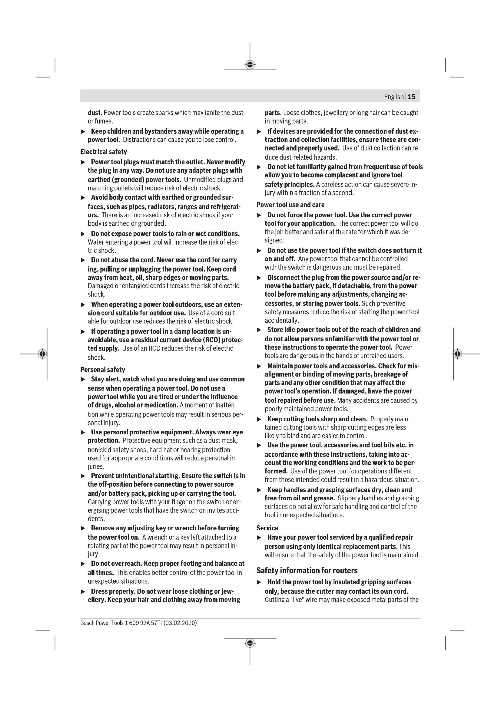 ufig mit einem Pinsel und schalten Sie einen Fehlerstrom-Schutzschalter (PRCD) vor. Bei der Bearbeitung von Metallen kann sich leitfahiger Staub im Innern des Elektrowerkzeugs abset- zen. Die Schutzisolierung des Elektrowerkzeugs kann be- eintrachtigt werden. Wenn ein Ersatz der Anschlussleitung erforderlich ist, dann ist dies von Bosch oder einer autorisierten Kundendienst- stelle für Bosch-Elektrowerkzeuge auszuführen, um Sicher- heitsgefährdungen zu vermeiden. Kundendienst und Anwendungsberatung Der Kundendienst beantwortet Ihre Fragen zu Reparatur und Wartung Ihres Produkts sowie zu Ersatzteilen. Explosions- zeichnungen und Informationen zu Ersatzteilen finden Sie auch unter: www.bosch-pt.com Das Bosch-Anwendungsberatungs-Team hilft Ihnen gerne bei Fragen zu unseren Produkten und deren Zubehör. www.powertool-portal.de, das Internetportal für Handwer- ker und Heimwerker. Geben Sie bei allen Rückfragen und Ersatzteilbestellungen bitte unbedingt die 10-stellige Sachnummer laut Typen- schild des Produkts an. Deutschland Robert Bosch Power Tools GmbH Servicezentrum Elektrowerkzeuge Zur Luhne 2 37589 Kalefeld – Willershausen Unter www.bosch-pt.de können Sie online Ersatzteile be- stellen oder Reparaturen anmelden. Kundendienst: Tel.: (0711) 40040460 Fax: (0711) 40040461 E-Mail: Servicezentrum.Elektrowerkzeuge@de.bosch.com Anwendungsberatung: Tel.: (0711) 40040460 Fax: (0711) 40040462 E-Mail: kundenberatung.ew@de.bosch.com Österreich Unter www.bosch-pt.at können Sie online Ersatzteile bestel- len. Tel.: (01) 797222010 Fax: (01) 797222011 E-Mail: service.elektrowerkzeuge@at.bosch.com Luxemburg Tel.: +32 2 588 0589 Fax: +32 2 588 0595 E-Mail: outillage.gereedschap@be.bosch.com Schweiz Unter www.bosch-pt.com/ch/de können Sie online Ersatz- teile bestellen. Tel.: (044) 8471511 Fax: (044) 8471551 E-Mail: Aftersales.Service@de.bosch.com Entsorgung Elektrogeräte, Akkus/Batterien, Zubehör und Verpackungen sollen einer umweltgerechten Wiederverwertung zugeführt werden. Werfen Sie Elektrogeräte und Akkus/Batterien nicht in den Hausmüll! Nur für EU-Länder: Gemäß der europäischen Richtlinie 2012/19/EU müssen nicht mehr gebrauchsfähige Elektrogeräte und gemäß der europäischen Richtlinie 2006/66/EG müssen defekte oder verbrauchte Akkus/Batterien getrennt gesammelt und einer umweltgerechten Wiederverwendung zugeführt werden. English Safety instructions General Power Tool Safety Warnings WARNING Read all safety warnings, instruc- tions, illustrations and specifica- tions provided with this power tool. Failure to follow all in- structions listed below may result in electric shock, fire and/ or serious injury. Save all warnings and instructions for future reference. The term "power tool" in the warnings refers to your mains- operated (corded) power tool or battery-operated (cord- less) power tool. Work area safety u Keep work area clean and well lit. Cluttered or dark areas invite accidents. u Do not operate power tools in explosive atmospheres, such as in the presence of flammable liquids, gases or 1 609 92A 57T | (03.02.2020) Bosch Power ToolsEnglish | 15 dust. Power tools create sparks which may ignite the dust or fumes. u Keep children and bystanders away while operating a power tool. Distractions can cause you to lose control. Electrical safety u Power tool plugs must match the outlet. Never modify the plug in any way. Do not use any adapter plugs with earthed (grounded) power tools. Unmodified plugs and matching outlets will reduce risk of electric shock. u Avoid body contact with earthed or grounded sur- faces, such as pipes, radiators, ranges and refrigerat- ors. There is an increased risk of electric shock if your body is earthed or grounded. u Do not expose power tools to rain or wet conditions. Water entering a power tool will increase the risk of elec- tric shock. u Do not abuse the cord. Never use the cord for carry- ing, pulling or unplugging the power tool. Keep cord away from heat, oil, sharp edges or moving parts. Damaged or entangled cords increase the risk of electric shock. u When operating a power tool outdoors, use an exten- sion cord suitable for outdoor use. Use of a cord suit- able for outdoor use reduces the risk of electric shock. u If operating a power tool in a damp location is un- avoidable, use a residual current device (RCD) protec- ted supply. Use of an RCD reduces the risk of electric shock. Personal safety u Stay alert, watch what you are doing and use common sense when operating a power tool. Do not use a power tool while you are tired or under the influence of drugs, alcohol or medication. A moment of inatten- tion while operating power tools may result in serious per- sonal injury. u Use personal protective equipment. Always wear eye protection. Protective equipment such as a dust mask, non-skid safety shoes, hard hat or hearing protection used for appropriate conditions will reduce personal in- juries. u Prevent unintentional starting. Ensure the switch is in the off-position before connecting to power source and/or battery pack, picking up or carrying the tool. Carrying power tools with your finger on the switch or en- ergising power tools that have the switch on invites acci- dents. u Remove any adjusting key or wrench before turning the power tool on. A wrench or a key left attached to a rotating part of the power tool may result in personal in- jury. u Do not overreach. Keep proper footing and balance at all times. This enables better control of the power tool in unexpected situations. u Dress properly. Do not wear loose clothing or jew- ellery. Keep your hair and clothing away from moving parts. Loose clothes, jewellery or long hair can be caught in moving parts. u If devices are provided for the connection of dust ex- traction and collection facilities, ensure these are con- nected and properly used. Use of dust collection can re- duce dust-related hazards. u Do not let familiarity gained from frequent use of tools allow you to become