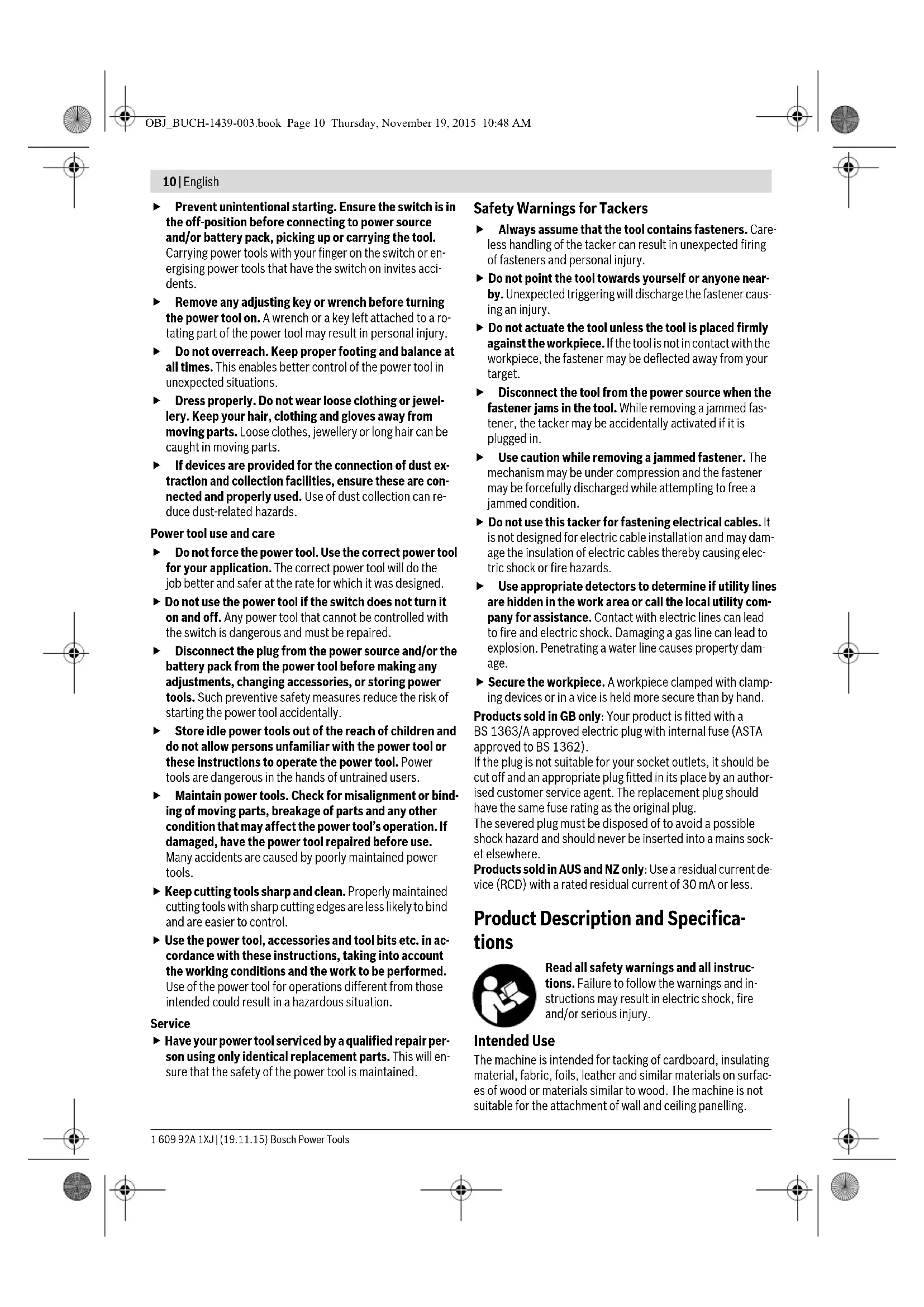 Use personal protective equipment. Always wear eye protection. Protective equipment such as dust mask, non-skid safety shoes, hard hat, or hearing protection used for appropriate conditions will reduce personal injuries. WARNING OBJ_BUCH-1439-003.book Page 9 Thursday, November 19, 2015 10:48 AM10 | English 1 609 92A 1XJ | (19.11.15) Bosch Power Tools Prevent unintentional starting. Ensure the switch is in the off-position before connecting to power source and/or battery pack, picking up or carrying the tool. Carrying power tools with your finger on the switch or en- ergising power tools that have the switch on invites acci- dents. Remove any adjusting key or wrench before turning the power tool on. A wrench or a key left attached to a ro- tating part of the power tool may result in personal injury. Do not overreach. Keep proper footing and balance at all times. This enables better control of the power tool in unexpected situations. Dress properly. Do not wear loose clothing or jewel- lery. Keep your hair, clothing and gloves away from moving parts. Loose clothes, jewellery or long hair can be caught in moving parts. If devices are provided for the connection of dust ex- traction and collection facilities, ensure these are con- nected and properly used. Use of dust collection can re- duce dust-related hazards. Power tool use and care Do not force the power tool. Use the correct power tool for your application. The correct power tool will do the job better and safer at the rate for which it was designed. Do not use the power tool if the switch does not turn it on and off. Any power tool that cannot be controlled with the switch is dangerous and must be repaired. Disconnect the plug from the power source and/or the battery pack from the power tool before making any adjustments, changing accessories, or storing power tools. Such preventive safety measures reduce the risk of starting the power tool accidentally. Store idle power tools out of the reach of children and do not allow persons unfamiliar with the power tool or these instructions to operate the power tool. Power tools are dangerous in the hands of untrained users. Maintain power tools. Check for misalignment or bind- ing of moving parts, breakage of parts and any other condition that may affect the power tool’s operation. If damaged, have the power tool repaired before use. Many accidents are caused by poorly maintained power tools. Keep cutting tools sharp and clean. Properly maintained cutting tools with sharp cutting edges are less likely to bind and are easier to control. Use the power tool, accessories and tool bits etc. in ac- cordance with these instructions, taking into account the working conditions and the work to be performed. Use of the power tool for operations different from those intended could result in a hazardous situation. Service Have your power tool serviced by a qualified repair per- son using only identical replacement parts. This will en- sure that the safety of the power tool is maintained. Safety Warnings for Tackers Always assume that the tool contains fasteners. Care- less handling of the tacker can result in unexpected firing of fasteners and personal injury. Do not point the tool towards yourself or anyone near- by. Unexpected triggering will discharge the fastener caus- ing an injury. Do not actuate the tool unless the tool is placed firmly against the workpiece. If the tool is not in contact with the workpiece, the fastener may be deflected away from your target. Disconnect the tool from the power source when the fastener jams in the tool. While removing a jammed fas- tener, the tacker may be accidentally activated if it is plugged in. Use caution while removing a jammed fastener. The mechanism may be under compression and the fastener may be forcefully discharged while attempting to free a jammed condition. Do not use this tacker for fastening electrical cables. It is not designed for electric cable installation and may dam- age the insulation of electric cables thereby causing elec- tric shock or fire hazards. Use appropriate detectors to determine if utility lines are hidden in the work area or call the local utility com- pany for assistance. Contact with electric lines can lead to fire and electric shock. Damaging a gas line can lead to explosion. Penetrating a water line causes property dam- age. Secure the workpiece. A workpiece clamped with clamp- ing devices or in a vice is held more secure than by hand. Products sold in GB only: Your product is fitted with a BS 1363/A approved electric plug with internal fuse (ASTA approved to BS 1362). If the plug is not suitable for your socket outlets, it should be cut off and an appropriate plug fitted in its place by an author- ised customer service agent. The replacement plug should have the same fuse rating as the original plug. The severed plug must be disposed of to avoid a possible shock hazard and should never be inserted into a mains sock- et elsewhere. Products sold in AUS and NZ only: Use a residual current de- vice (RCD) with a rated residual current of 30 mA or less. Product Description and Specifica- tions Read all safety warnings and all instruc- tions. Failure to follow the warnings and in- structions may result in electric shock, fire and/or serious injury. Intended Use The machine is intended for tacking of cardboard, insulating material, fabric, foils, leather and similar materials on surfac- es of wood or materials similar to wood. The machine is not suitable for the attachment of wall and ceiling panelling. OBJ_BUCH-1439-003.book Page 10 Thursday, November 19, 2015 10:48 AMEnglish | 11 Bosch Power Tools 1 609 92A 1XJ | (19.11.15) Product Features The numbering of the product features refers to the illustra- tion of the machine on the graphics page. 1 Tacker head 2 Selector switch for DuoTac-Automatic 3 Handle 4 Trigger 5 Thumbwheel for hammer-force preselection 6 Magazine release button 7 Refill indicator 8 Staple strip* 9 Magazine 1