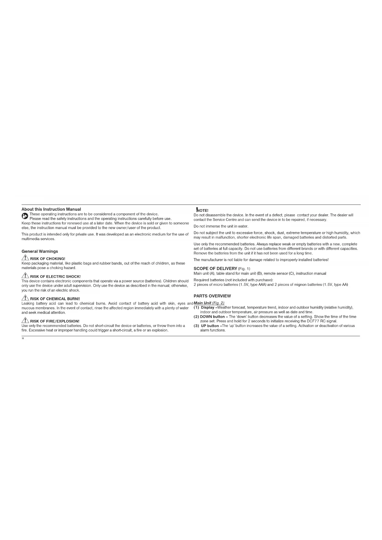 Garantie / Warranty10 About this Instruction Manual These operating instructions are to be considered a component of the device. Please read the safety instructions and the operating instructions carefully before use. Keep these instructions for renewed use at a later date. When the device is sold or given to someone else, the instruction manual must be provided to the new owner/user of the product. This product is intended only for private use. It was developed as an electronic medium for the use of multimedia services. General Warnings RISK OF CHOKING! Keep packaging material, like plastic bags and rubber bands, out of the reach of children, as these materials pose a choking hazard. RISK OF ELECTRIC SHOCK! This device contains electronic components that operate via a power source (batteries). Children should only use the device under adult supervision. Only use the device as described in the manual; otherwise, you run the risk of an electric shock. RISK OF CHEMICAL BURN!! Leaking battery acid can lead to chemical burns. Avoid contact of battery acid with skin, eyes and mucous membranes. In the event of contact, rinse the affected region immediately with a plenty of water and seek medical attention. RISK OF FIRE/EXPLOSION! Use only the recommended batteries. Do not short-circuit the device or batteries, or throw them into a fire. Excessive heat or improper handling could trigger a short-circuit, a fire or an explosion. NOTE! Do not disassemble the device. In the event of a defect, please contact your dealer. The dealer will contact the Service Centre and can send the device in to be repaired, if necessary. Do not immerse the unit in water. Do not subject the unit to excessive force, shock, dust, extreme temperature or high humidity, which may result in malfunction, shorter electronic life span, damaged batteries and distorted parts. Use only the recommended batteries. Always replace weak or empty batteries with a new, complete set of batteries at full capacity. Do not use batteries from different brands or with different capacities. Remove the batteries from the unit if it has not been used for a long time. The manufacturer is not liable for damage related to improperly installed batteries! SCOPE OF DELIVERY (Fig. 1) Main unit (A), table stand for main unit (B), remote sensor (C), instruction manual Required batteries (not included with purchase): 2 pieces of micro batteries (1.5V, type AAA) and 2 pieces of mignon batteries (1.5V, type AA) PARTS OVERVIEW Main Unit (Fig. 2) (1) Display – Weather forecast, temperature trend, indoor and outdoor humidity (relative humidity), indoor and outdoor temperature, air pressure as well as date and time. (2) DOWN button – The ‘down’ button decreases the value of a setting. Show the time of the time zone set. Press and hold for 2 seconds to initialize receiving the DCF77 RC signal. (3) UP button – The ‘up’ button increases the value of a setting. Activation or deactivation of various alarm functions.11