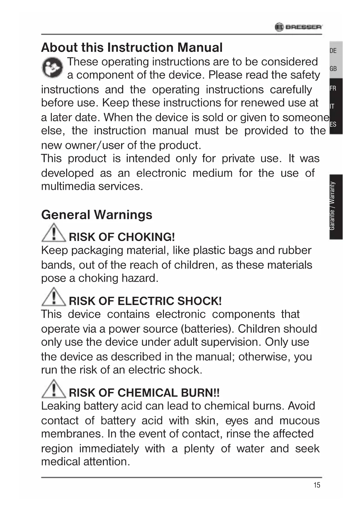 WARRANTY & SERVICE The regular guarantee period is 2 years and begins on the day of purchase. To benefit from an extended voluntary guarantee period as stated on the gift box, registration on our website is required. You can consult the full guarantee terms as well as information on extending the guarantee period and details of our services at www.bresser.de/warranty_terms. Would you like detailed instructions for this product in a particular language? Then visit our website via the link below (QR code) for available versions. Alternatively you can also send an email to manuals@bresser.de or leave a message on +49 (0) 28 72 – 80 74-220*. Please always state your name, precise address, a valid phone number and email address, as well as the article number and name. *Number charged at local rates in Germany (the amount you will be charged per phone call will depend on the tariff of your phone provider); calls from abroad will involve higher costs.61