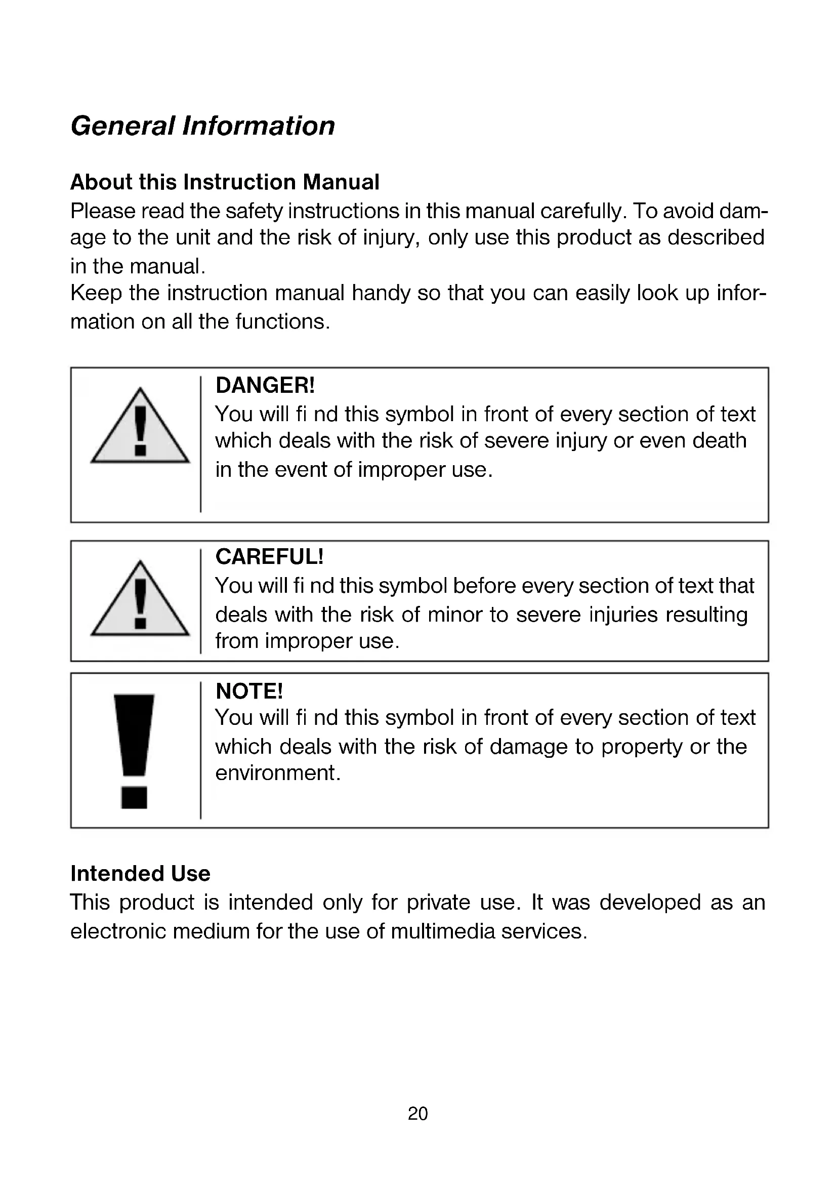 - Aufgrund von Einschränkungen der Druckmöglichkeiten kann die Darstellung der Anzeige in dieser Bedienung- sanleitung von der tatsächlichen Anzeige abweichen. Änderungen vorbehalten.20 General Information About this Instruction Manual Please read the safety instructions in this manual carefully. To avoid dam- age to the unit and the risk of injury, only use this product as described in the manual. Keep the instruction manual handy so that you can easily look up infor- mation on all the functions. DANGER! You will fi nd this symbol in front of every section of text which deals with the risk of severe injury or even death in the event of improper use. CAREFUL! You will fi nd this symbol before every section of text that deals with the risk of minor to severe injuries resulting from improper use. NOTE! You will fi nd this symbol in front of every section of text which deals with the risk of damage to property or the environment. Intended Use This product is intended only for private use. It was developed as an electronic medium for the use of multimedia services.GB/IE