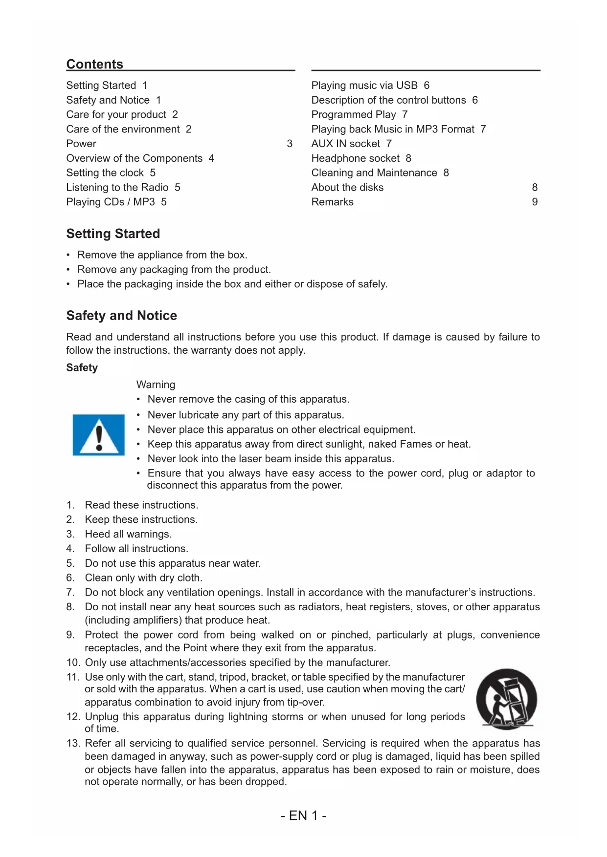 - Do not play music at excessive volume levels as damage to hearing and or the equipment may occur.