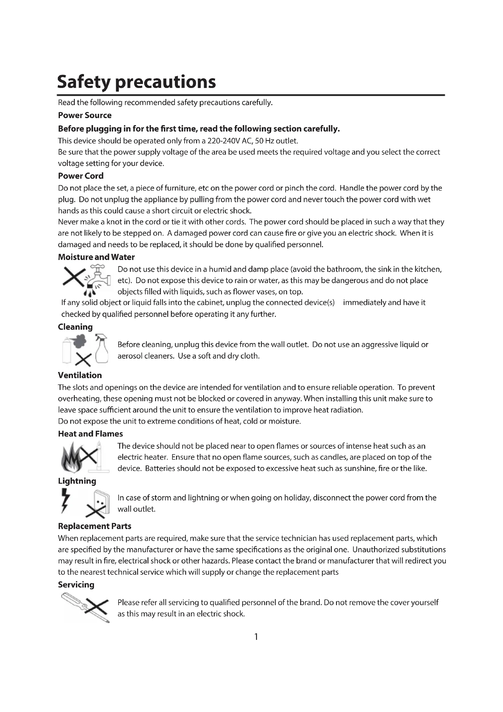 The lightning ash with arrowhead symbol, within an equilateral triangle, is intended to alert the user to the presence of not insulate, “dangerous voltage” within the product’s enclosure that may be of sucient magnitude to constitute a risk of electric shock of persons. The exclamation point within an equilateral triangle is intended to alert the user to the presence of important operating and maintenance (servicing) instructions in the literature accompanying the appliance. Risk of electric shock Instructions for waste disposal: - Packaging and packaging aids are recyclable and should principally be recycled. Packaging materials, such as a plastic bag, must be kept away from children. - Batteries, including those which are heavy metal-free, should not be disposed of with household waste. Please dispose of used batteries in an environmentally friendly manner. Find out about the legal regulations which apply in your area- Do not try to recharge batteries, can have a danger of explosion. Replace batteries only with the same or equivalent type. This symbol on the product or on its packaging means that your electrical device should be disposed at the end of its service life, separately from your household wastes. There are separate collection systems for recycling in the EU. For more information, please contact the local authority or the dealer where you purchased the product. Waste Disposal The mains plug is used to disconnect the device from the mains and therefore it must remain readily operable. Disconnecting the Device To prevent injury, this device must be securely attached to the wall in accordance with the installation instructions when mounted to the wall (if the option is available). Installation Never let children use electrical devices unsupervised. Children cannot always recognize any possible dangers. Batteries / accumulators can be life threatening when swallowed. Store batteries out of the reach of children. In case of swallowing a battery, medical aid has to be sought immediately. Also keep the packaging away from children as there is danger of suocation. Electrical device not in the hands of children In your device has headphones jack, please note that excessive sound pressure from earphones and headphones can cause hearing loss. Headphone Volume Do not leave your device in standby or operating mode when you leave your house. The Standby / On button does not fully switch o this product. Moreover the device continues to consume power in standby mode. In order to separate the device completely from mains, the mains plug has to be pulled from the mains socket. Because of that the device should be set up in a way, that an unobstructed access to the mains socket is guaranteed, so that in case of emergency the mains plug can be pulled immediately. During periods of prolonged non-use, the device should be disconnected from the mains power supply.