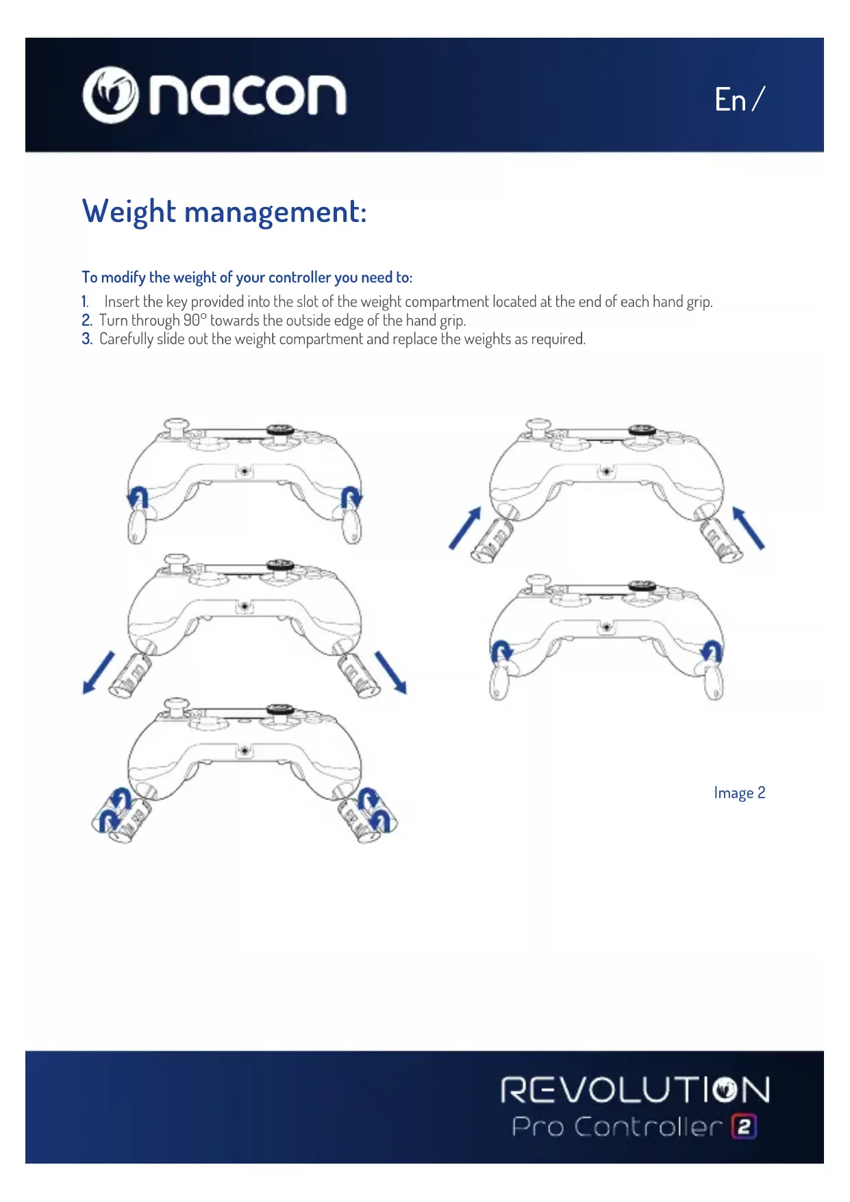 Weight management: Image 2En / REVOLUTION Pro Controller 2 Thank you for purchasing this NACON product. In case of a malfunction please refer to the support information at the end of this manual. We highly appreciate any feedback which helps us to improve our products. Please keep this instruction manual for future reference. Warranty This product bearing the NACON trademark, is guaranteed by the manufacturer “Bigben Interactive” for a period of 2 years from the date of purchase, and will, during this period, be replaced with the same or a similar model, at our option, free of charge if there is a defect due to faulty material or workmanship. This guarantee can be exercised with the proof of purchase in support (e.g. sale receipt; invoice….) and the packaging only for mail-order selling. For cables of controller, beyond one request of guarantee per year, the client shall have to send back the controller with the cable for lab expertise as it is recalled this guarantee does not cover defects arising from accidental damage, misuse or wear and tear and is available only to the original purchaser of the product. This does not affect your statutory rights. For more warranty and support information, email support@nacongaming.com or visit www.nacongaming.com Contents of the package 1 x REVOLUTION Pro Controller 2 1 x 3m connection cable 1 x Instruction manual 2 x 10g weights 2 x 14g weights 2 x 17g weights 1 x Key for the weight compartment 1 x Pouch Features This controller has 3 x modes: Mode 1 = PS4™ Pro Control Mode (see section 2) Mode 2 = PS4™ Advanced Mode (see section 3) Mode 3 = PC Advanced Mode (see section 4)En / Image 3 1/ How to use the REVOLUTION Pro Controller 2 Note: Do not touch the sticks or triggers when you connect your controller to any PS4™ system.