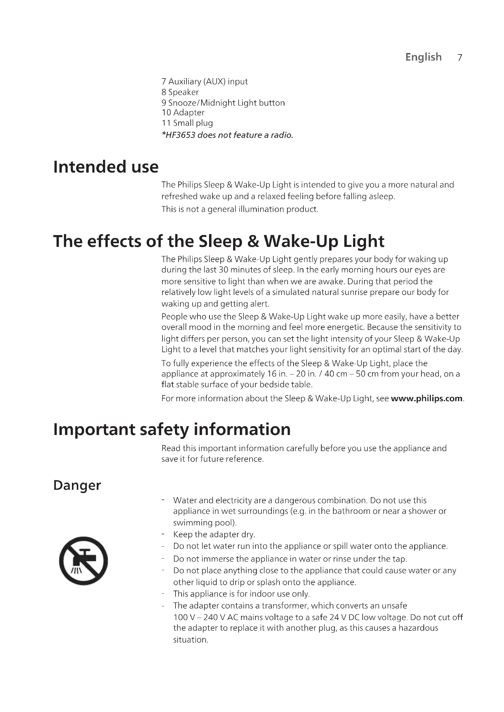 English Contents Introduction _____________________________________________________________________________ 6 General description________________________________________________________________________ 6 Intended use _____________________________________________________________________________ 7 The effects of the Sleep & Wake-Up Light_____________________________________________________ 7 Important safety information _______________________________________________________________ 7 Safety and compliance _____________________________________________________________________ 9 Electromagnetic fields (EMF)________________________________________________________________ 9 Interactive menu icons _____________________________________________________________________ 10 Navigating the menu ______________________________________________________________________ 11 Setting wake-up profiles ___________________________________________________________________ 11 Time + alarm back-up ______________________________________________________________________ 12 Snoozing_________________________________________________________________________________ 12 Dismissing the alarm_______________________________________________________________________ 12 Using the Sleep & Wake-Up Light as a bedside lamp ___________________________________________ 13 Midnight Light ____________________________________________________________________________ 13 Settings __________________________________________________________________________________ 13 Music ____________________________________________________________________________________ 15 Wind-down programs _____________________________________________________________________ 16 Charging your mobile phone _______________________________________________________________ 17 Cleaning and storage ______________________________________________________________________ 17 Recycling_________________________________________________________________________________ 18 Warranty and support _____________________________________________________________________ 18 Troubleshooting __________________________________________________________________________ 18 Open-source and third-party software _______________________________________________________ 20 Specifications _____________________________________________________________________________ 20 Introduction Congratulations on your purchase and welcome to Philips! To fully benefit from the support that Philips offers, register your product at www.philips.com/welcome. The Philips Sleep & Wake-Up Light helps you wake up more pleasantly. If the Sunrise Simulation is active, the light intensity of the lamp gradually increases to the set level and the light color changes from deep morning red to bright daylight. The light gently prepares your body for waking up at the set time. To make waking up an even more pleasant experience, you can use natural wake- up sounds or the FM radio* to wake up to. *HF3653 does not feature a radio. General description 1 Lamp housing 2 Display 3 USB charging port 4 Reset button 5 Radio antenna* 6 Adapter DC socket7 English 7 Auxiliary (AUX) input 8 Speaker 9 Snooze/Midnight Light button 10 Adapter 11 Small plug *HF3653 does not feature a radio. Intended use The Philips Sleep & Wake-Up Light is intended to give you a more natural and refreshed wake up and a relaxed feeling before falling asleep. This is not a general illumination product. The effects of the Sleep & Wake-Up Light The Philips Sleep & Wake-Up Light gently prepares your body for waking up during the last 30 minutes of sleep. In the early morning hours our eyes are more sensitive to light than when we are awake. During that period the relatively low light levels of a simulated natural sunrise prepare our body for waking up and getting alert. People who use the Sleep & Wake-Up Light wake up more easily, have a better overall mood in the morning and feel more energetic. Because the sensitivity to light differs per person, you can set the light intensity of your Sleep & Wake-Up Light to a level that matches your light sensitivity for an optimal start of the day. To fully experience the effects of the Sleep & Wake-Up Light, place the appliance at approximately 16in. –20in. / 40cm –50cm from your head, on a flat stable surface of your bedside table. For more information about the Sleep & Wake-Up Light, see www.philips.com. Important safety information Read this important information carefully before you use the appliance and save it for future reference. Danger