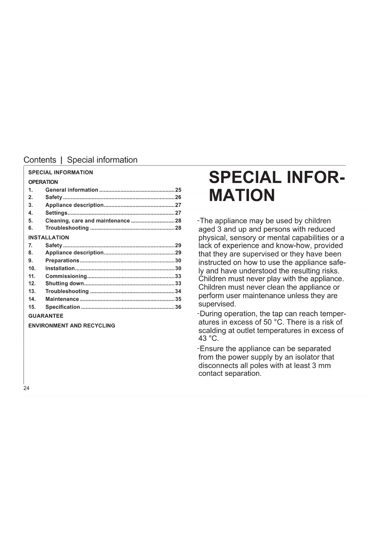 SPECIAL INFOR- MATION - The appliance may be used by children aged 3 and up and persons with reduced physical, sensory or mental capabilities or a lack of experience and know-how, provided that they are supervised or they have been instructed on how to use the appliance safe- ly and have understood the resulting risks. Children must never play with the appliance. Children must never clean the appliance or perform user maintenance unless they are supervised. - During operation, the tap can reach temper- atures in excess of 50 °C. There is a risk of scalding at outlet temperatures in excess of 43 °C. - Ensure the appliance can be separated from the power supply by an isolator that disconnects all poles with at least 3 mm contact separation.Operation - for users and contractors
