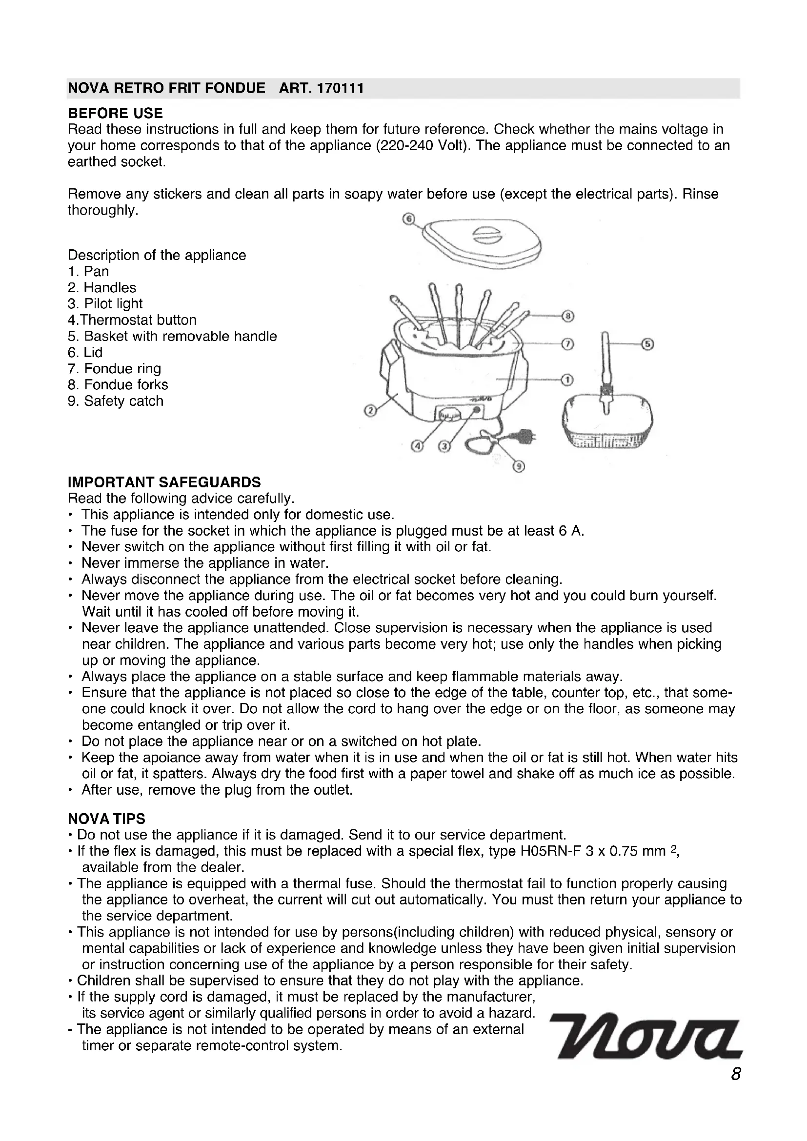 Download the instructions for your Deep fryer in PDF format for free! Find your manual 170111 - NOVA and take your electronic device back in hand. On this page are published all the documents necessary for the use of your device. 170111 by NOVA.