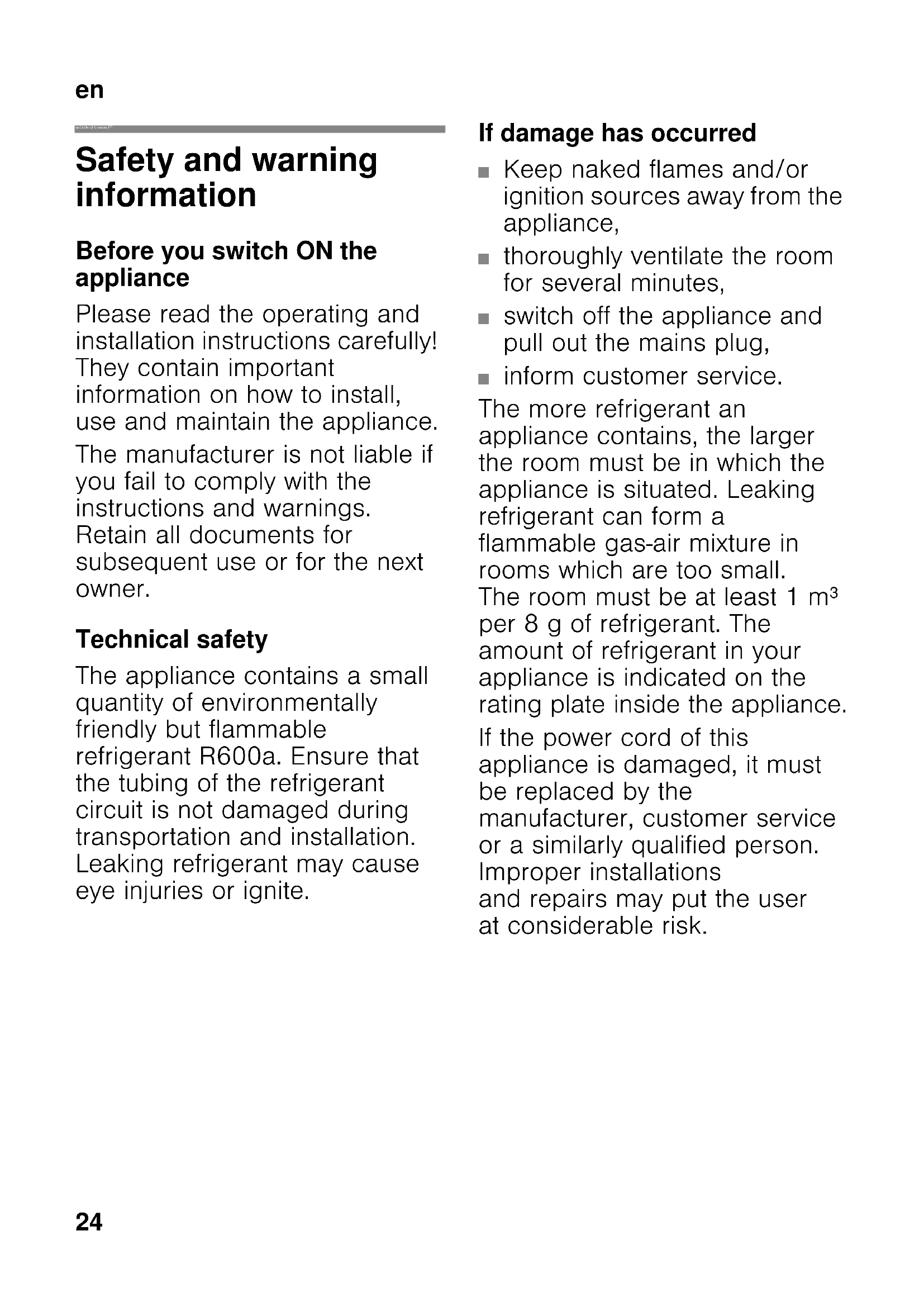 enTable of Contents enInstruction for Use Safety and warning information Before you switch ON the appliance Please read the operating and installation instructions carefully! They contain important information on how to install, use and maintain the appliance. The manufacturer is not liable if you fail to comply with the instructions and warnings. Retain all documents for subsequent use or for the next owner. Technical safety The appliance contains a small quantity of environmentally friendly but flammable refrigerant R600a. Ensure that the tubing of the refrigerant circuit is not damaged during transportation and installation. Leaking refrigerant may cause eye injuries or ignite. If damage has occurred ■ Keep naked flames and/or ignition sources away from the appliance, ■ thoroughly ventilate the room for several minutes, ■ switch off the appliance and pull out the mains plug, ■ inform customer service. The more refrigerant an appliance contains, the larger the room must be in which the appliance is situated. Leaking refrigerant can form a flammable gas-air mixture in rooms which are too small. The room must be at least 1 m³ per 8 g of refrigerant. The amount of refrigerant in your appliance is indicated on the rating plate inside the appliance. If the power cord of this appliance is damaged, it must be replaced by the manufacturer, customer service or a similarly qualified person. Improper installations and repairs may put the user at considerable risk.en