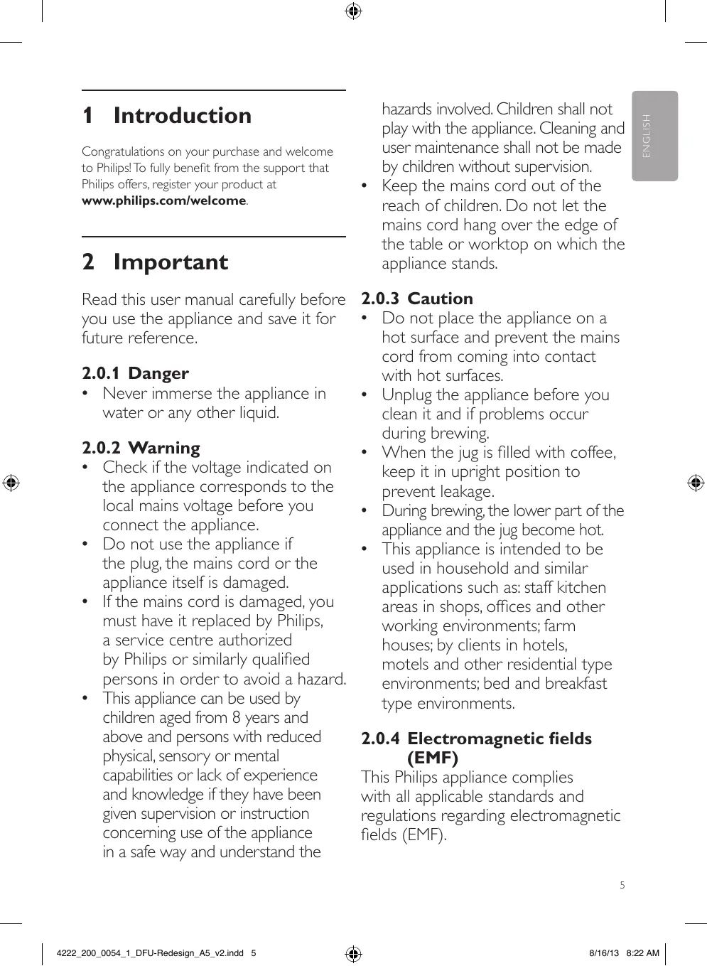 •• Ne posez jamais l’appareil sur une 2.0.2 Avertissement surface chaude et veillez à ce que •• Avant de brancher l’appareil, le cordon d’alimentation ne soit vérifiez que la tension indiquée sur pas en contact avec des surfaces l’appareil correspond à la tension chaudes. supportée par le secteur local. •• Débranchez toujours l’appareil •• N’utilisez jamais l’appareil si la avant de le nettoyer et en cas de prise, le cordon d’alimentation problème lors de la préparation ou l’appareil lui-même est du café. endommagé. •• Lorsque la verseuse est remplie •• Si le cordon d’alimentation est de café, maintenez-la en position endommagé, il doit être remplacé verticale pour éviter toute fuite. par Philips, un Centre Service • • La partie inférieure de l’appareil et le Agréé ou un technicien qualifié fond de la verseuse sont très chauds afin d’éviter tout accident. pendant la préparation du café. •• Cet appareil peut être utilisé par • • Cet appareil est destiné à un des enfants âgés de 8 ans ou plus, usage domestique et dans des des personnes dont les capacités environnements similaires tels physiques, sensorielles ou que : les cuisines destinées aux intellectuelles sont réduites ou des Replacez le réservoir d’eau sur dans des hôtels, motels et autres l’appareil (fig. 4). environnements résidentiels ; les Ne placez pas de filtre ni de café dans le chambres d’hôte. porte-filtre. 2.0.4 C hamps électromagnétiques (CEM) Cet appareil Philips est conforme à toutes les normes et à tous les règlements applicables relatifs à l’exposition aux champs électromagnétiques (CEM).