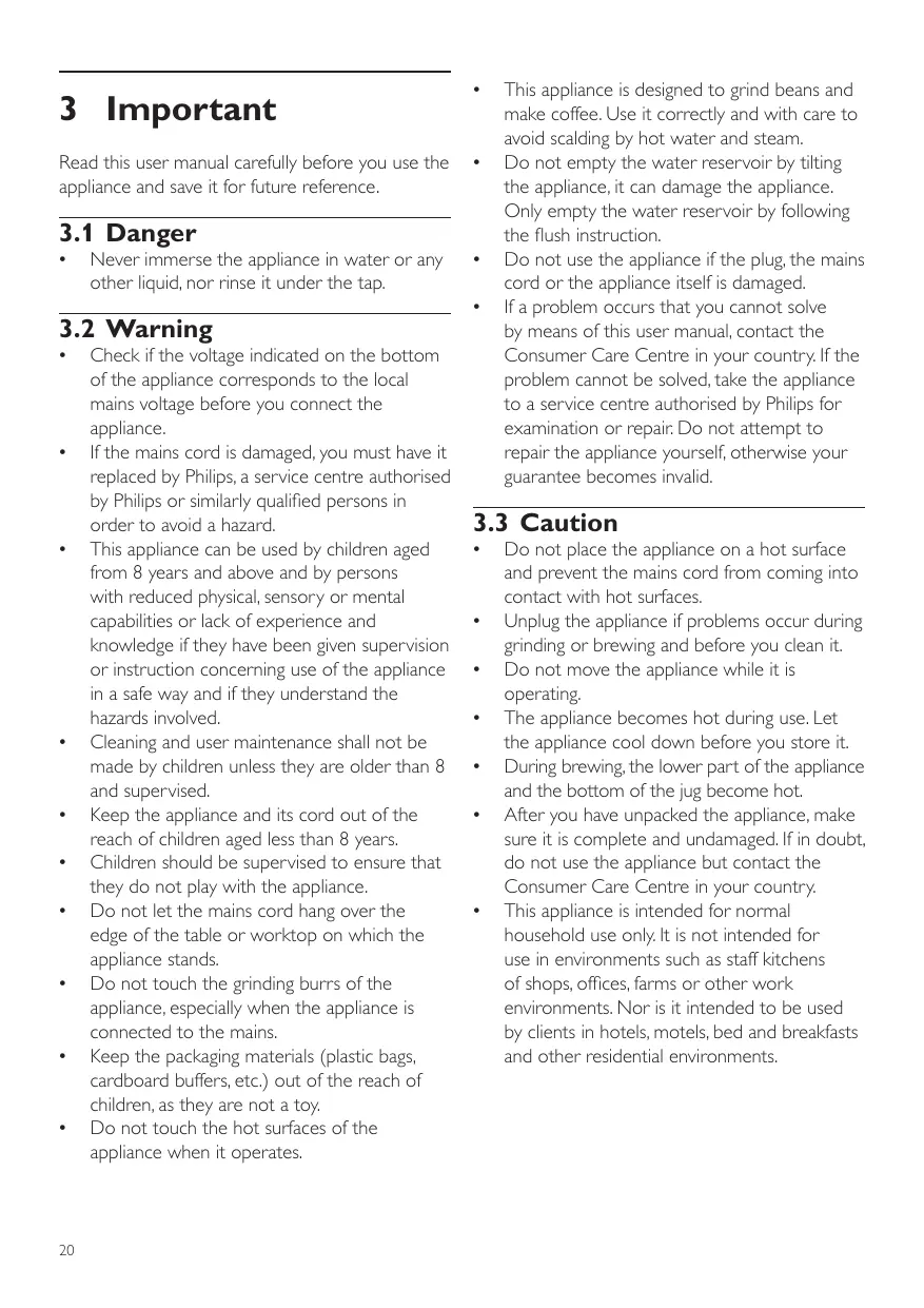 Français Service Agréé Philips ou par un technicien qualifié afin d’éviter tout accident. •• Cet appareil peut être utilisé par des enfants âgés de 8 ans ou plus, des personnes dont les capacités physiques, sensorielles ou intellectuelles sont réduites ou des personnes manquant d’expérience et de connaissances, à condition que ces enfants ou personnes soient sous surveillance ou qu’ils aient reçu des instructions quant à l’utilisation sécurisée de l’appareil et qu’ils aient pris connaissance des dangers encourus. •• Le nettoyage et l’entretien ne doivent pas être réalisés par des enfants sauf s’ils sont âgés de plus de 8 ans et sous surveillance. •• Tenez l’appareil et son cordon hors de portée des enfants de moins de 8 ans. •• Veillez à ce que les enfants ne puissent pas jouer avec l’appareil. •• Ne laissez pas le cordon pendre de la table ou du plan de travail sur lequel l’appareil est posé. •• Ne touchez pas aux meules de l’appareil, surtout lorsque ce dernier est branché. •• Les emballages (sacs en plastique, cartons de protection, etc.) ne sont pas des jouets. Tenezles hors de portée des enfants. •• Ne touchez pas les surfaces chaudes de l’appareil pendant son fonctionnement.