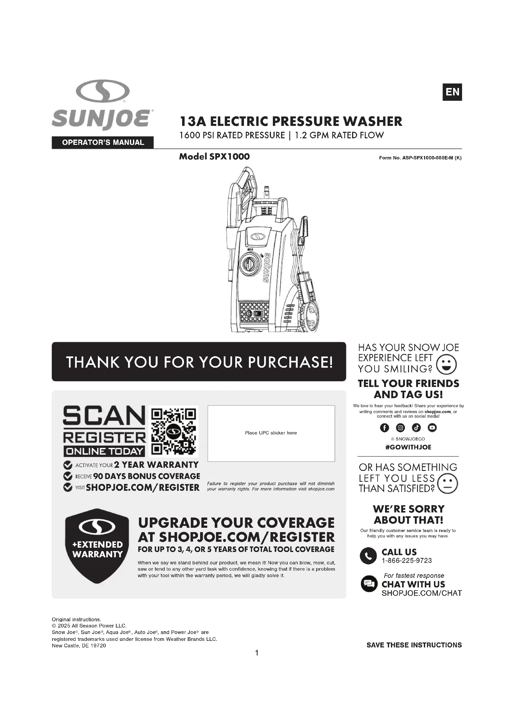 Original instructions.© 2025 All Season Power LLC.Snow Joe , Sun Joe , Aqua Joe , Auto Joe , and Power Joe are registered trademarks used under license from Weather Brands LLC.New Castle, DE 19720SAVE THESE INSTRUCTIONS THANK YOU FOR YOUR PURCHASE! Failure to register your product purchase will not diminish your warranty rights. For more information visit shopjoe.com Place UPC sticker here