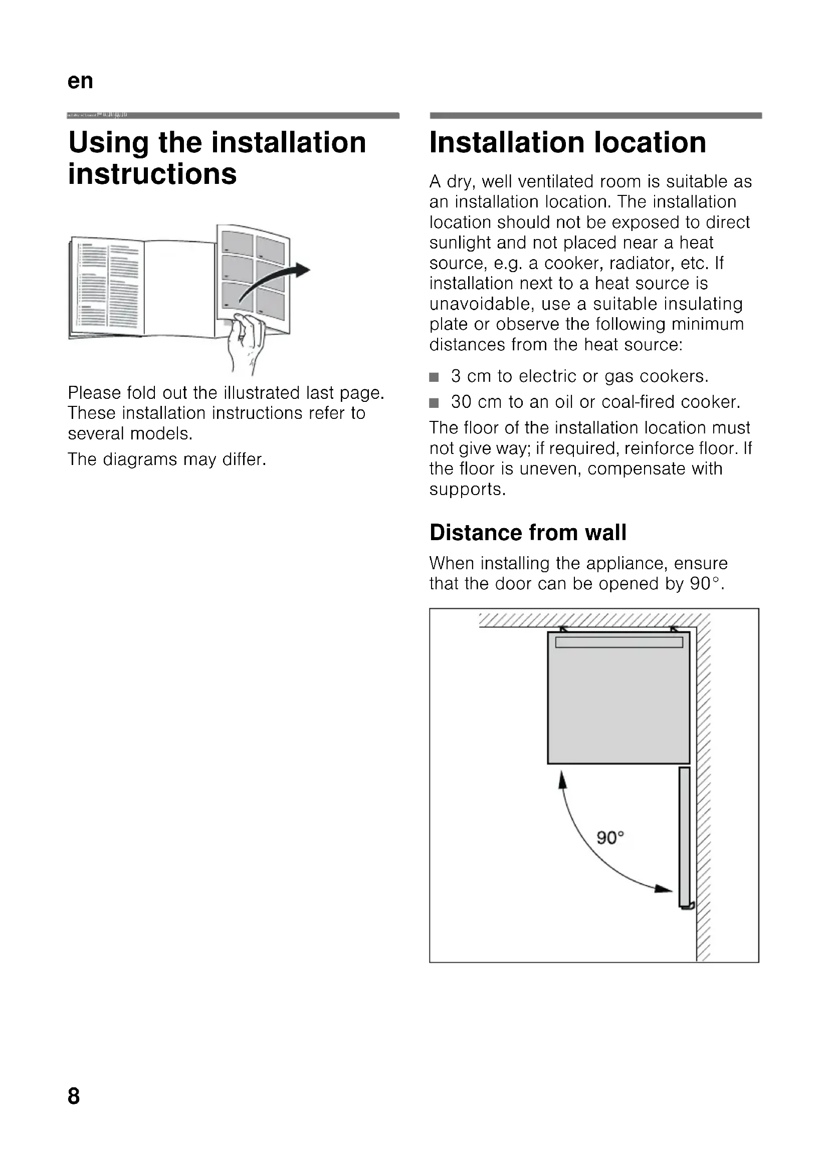 enTable of Content s enInstallation in structions Free-standing appliance Using the installation instructions Please fold out the illustrated last page. These installation instructions refer to several models. The diagrams may differ. Installation location A dry, well ventilated room is suitable as an installation location. The installation location should not be exposed to direct sunlight and not placed near a heat source, e.g. a cooker, radiator, etc. If installation next to a heat source is unavoidable, use a suitable insulating plate or observe the following minimum distances from the heat source: ■ 3 cm to electric or gas cookers. ■ 30 cm to an oil or coal-fired cooker. The floor of the installation location must not give way; if required, reinforce floor. If the floor is uneven, compensate with supports. Distance from wall When installing the appliance, ensure that the door can be opened by 90°.en